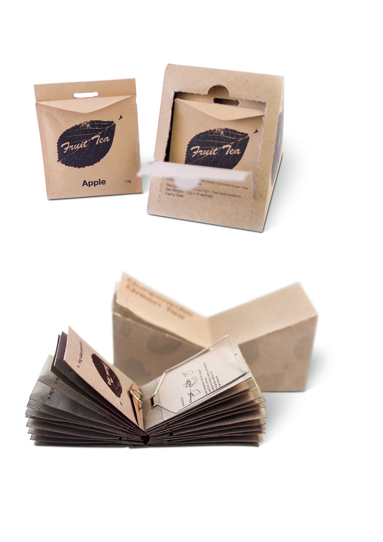 The packaging design of this tea brand follows a space- and resource-saving concept: a triangular paper box contains ten teabags, arranged in a fan-like way to avoid any unnecessary gaps between them. Also, the off-the-shelf packaging sizes allow for particularly efficient transportation of the product. The individual teabags are arranged in a fan shape with a metal loop, so that the sculptural teabag arrangement can be decoratively placed on a table. When brewing the tea, a single teabag is hung on a spoon through a small incision, which is then placed across the cup for steeping. Afterwards, the teabag may be disposed of easily and in an environmentally sound way.