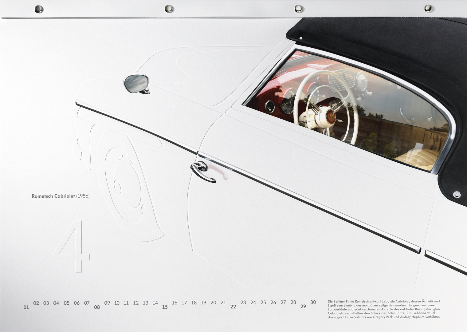 The “Volkswagen Classic” calendar deals with the maintenance and preservation of old Volkswagen cars. So as to generate awareness of the brand and its service, the calendar shows that design, first and foremost, makes vehicles worthy of preservation. However, the images merely hint at the vehicles’ characteristic lines and shapes; instead, they make use of high-quality paper with the greatest possible embossing. Thus, observers can run a hand over the individual pages and obtain a haptic experience of the contours characteristic for a classic Volkswagen.