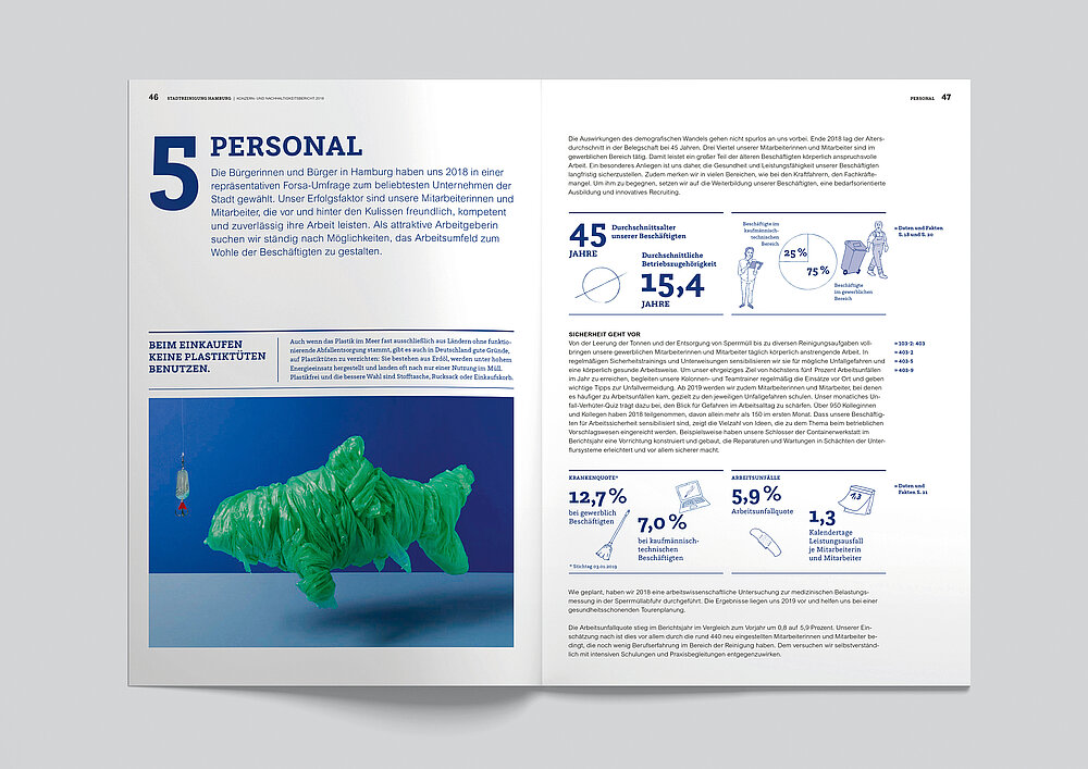 With its core business of resource and waste management, Stadtreinigung Hamburg is one of the pioneers of the circular economy in Germany. Its company and sustainability report uses simple language, informative and concise content, as well as infographics that represent more complex relationships and the most important facts and figures, making the publication interesting for both experts and citizens. The sustainability magazine LOOP, published together with the report, presents the focal topic of plastic for a large target group from many angles, with interviews, infographics and articles. An eye-catching feature is the photo gallery, which contains tips for avoiding plastic.