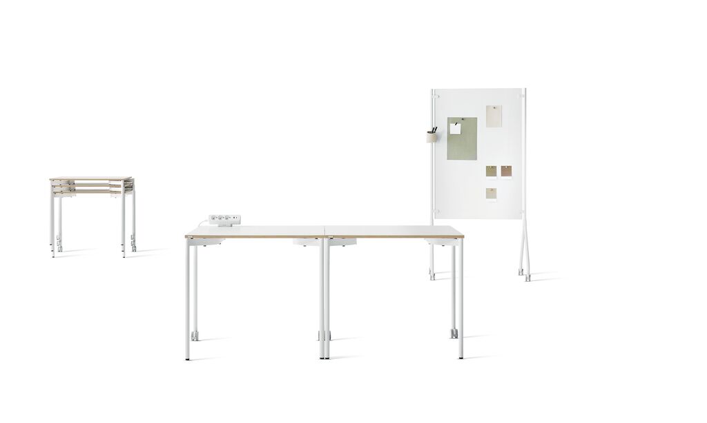 Die von hoher Mobilität gekennzeichnete Möbelserie Start-Up-Grade besteht aus einem Tisch und einer Tafel auf Rollen sowie nützlichen Accessoires wie beweglichen Steckdosenleisten und aufsteckbaren Filztaschen. Je nach Bedarf können die leichten Möbelstücke flexibel im Raum angeordnet werden. Speziell die schlank gestaltete Tafel übernimmt verschiedene Aufgaben – mal fungiert sie als Pinnwand, mal als Raumteiler, um kleine Büros in zwei Bereiche zu unterteilen. Um den Tisch leichter bewegen zu können, verfügen jeweils zwei der Tischbeine über Rollen. Um Platz zu sparen, kann er gestapelt und vertikal gelagert werden.