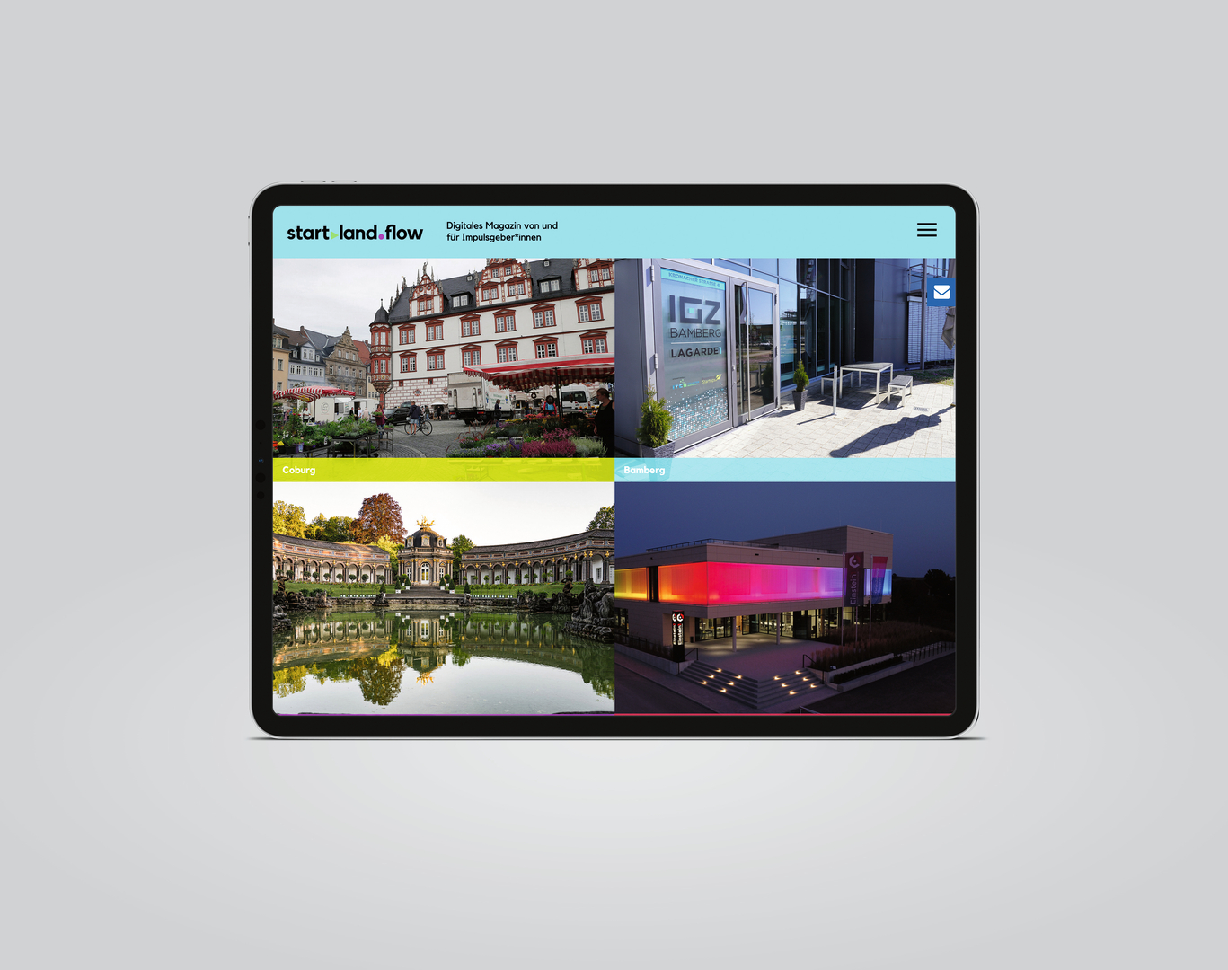The digital magazine “start.land.flow” was launched in the form of a website by IGZ Bamberg GmbH as part of a pilot project. IGZ helps young companies, start-ups and creative minds with a range of services, and supports networking between entrepreneurs and the world of science. Its aim is to create synergies and jointly advance the start-up culture, knowledge transfer and digital innovation in rural areas. The website intends to serve as an interface between people, and comprises Upper Franconian start-up stories, information about digitalisation and innovations, guides, networks and an event calendar – all presented in a colourful, engaging way.
