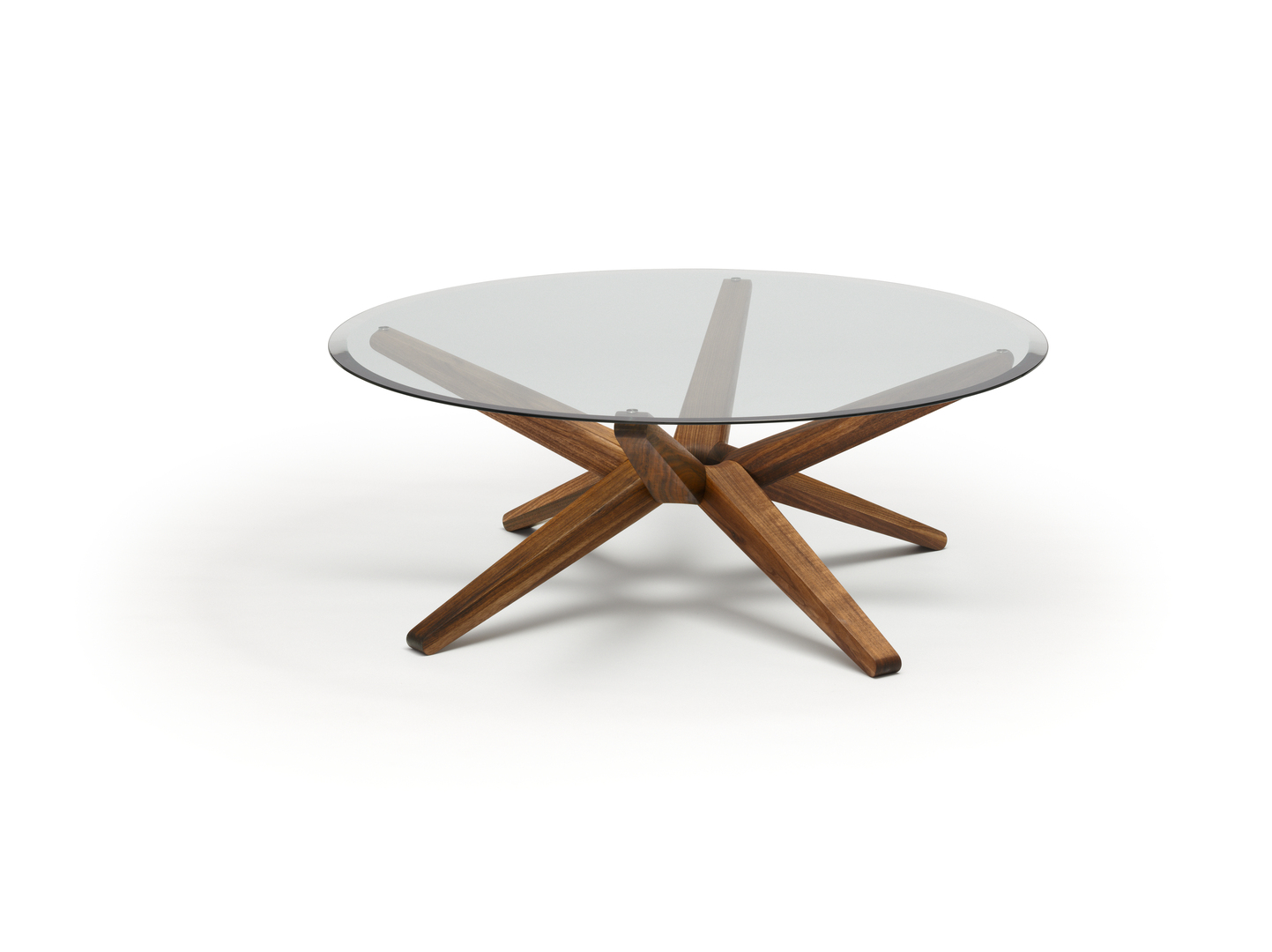 Durch seine geometrische Formensprache und außergewöhnliche Konstruktion wirkt dieser Tisch wie eine Skulptur. Sein Herzstück ist ein ringförmiger, technisch und formal beeindruckender Knotenpunkt. Aus ihm entspringen acht identische, jeweils aus edlem Naturholz vollplastisch herausgefräste Strahlen. Im Wechsel nach oben und unten ausgerichtet, bilden diese gleichsam Standbein und Träger einer runden Glasplatte, die über dem Strahlenkranz zu schweben scheint. Das 8 mm dicke und von unten facettierte Glas sorgt zudem für reizvolle Lichteffekte.