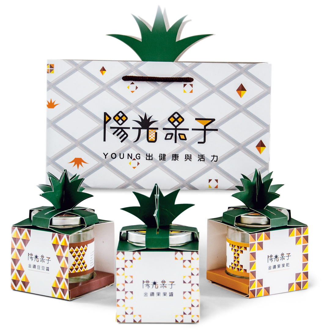 Sunshine Fruit adopts an unusual way to market pineapple products. The package design is based on a geometrical form and the focus is on two things: the fruit itself and the sun, which is necessary for a good crop. The gift packaging consists of cardboard which encloses the jar with the pineapple product. The outer wrapping itself brings to mind the fruit. The upper part is a reproduction of the leaf crown; the colour scheme is yellow, orange and brown, corresponding to the appearance of a sun-ripened pineapple.