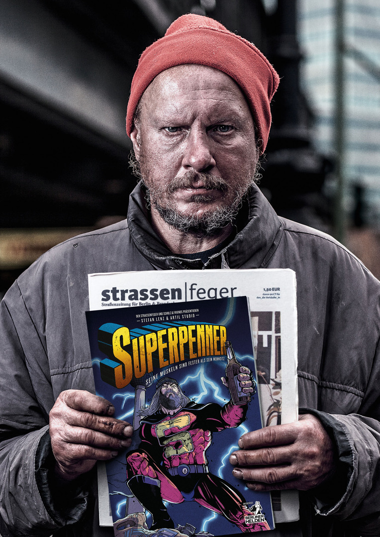 Superhobo is a campaign with the aim of raising money for homeless people after Christmas. Realised as a comic supplement for the Berlin street paper “strassenfeger”, homeless people are depicted as superheroes. In the best Marvel comic tradition, it tells the story of a hobo who acquires a superpower by accident. Endowed with superhuman strength when he downs a beer, he and his sidekick Gutter Girl take on “The Baddies”. When he is close to defeat and the whole city of Berlin is in serious danger, Convenience Store Man saves him by providing a beer in the nick of time.