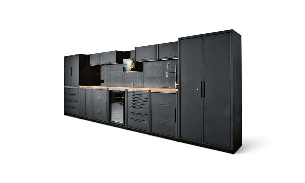 Die SW STAHL Werkstattküche TB8000 wurde als modulares System konzipiert, das flexibel kombiniert und erweitert werden kann. Strapazierfähige, mattschwarze Oberflächen und eine hochwertige Verarbeitung sorgen für Langlebigkeit, während die durchdachten Kombinationsmöglichkeiten eine effiziente Nutzung gewährleisten. Ergonomische Griffleisten an Türen und Schubladen tragen zu einem klaren Erscheinungsbild bei, das sich in jede Arbeitsumgebung stimmig einfügt.
