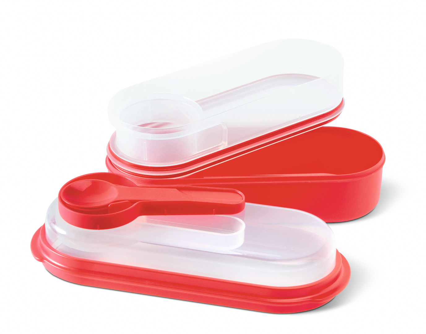 Swivel ist eine Lunch-Box, die in drei Bereiche aufgeteilt ist. Ein zylindrischer Behälter für Soßen oder feuchtes Obst hält die zwei größeren, ovalen Behälter zusammen. Das obere Fach lässt sich seitlich herausschwenken, sodass auf alle Speisen zeitgleich zugegriffen werden kann. Die aufgefächerte Lunch-Box kann leicht mit einer Hand gehalten werden, während die andere Hand das im Deckel integrierte Besteck nutzt. Nach dem Gebrauch können die spülmaschinenfesten Einzelteile voneinander getrennt und gesäubert werden.