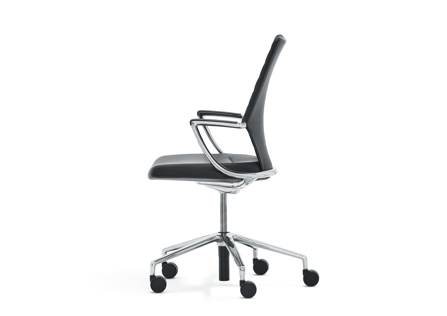 Das Erscheinungsbild von Swurve wird maßgeblich von seinen eleganten Armlehnen bestimmt, die wie eine organische Erweiterung, ausgehend vom Verbindungspunkt hinter der Rückenlehne, wirken. Um die klare Linienführung dieses klimaneutralen Bürostuhls zu betonen, ist die für eine gute Ergonomie notwendige Technik verborgen integriert. So ist sowohl die Spannung zwischen Netzrücken und Rahmen zur Unterstützung der Lendenwirbelsäule als auch der patentierte Syncro-Kippmechanismus, der eine synchrone Bewegung zwischen Sitz und Rücken ermöglicht, für das Auge unsichtbar.