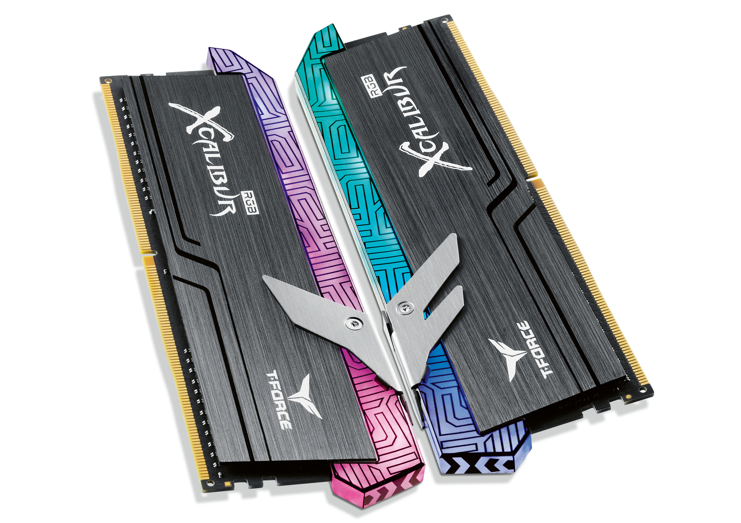 Das Speichermodul T-Force Xcalibur verkörpert das berühmte Schwert von König Artus. Umgesetzt wird dieser Gestaltungsansatz über tattooähnliche Muster auf dem Lichtführungspanel, das mit seiner scharfen Kante einer Klinge nachempfunden ist. Eine vollfarbige RGB-LED-Beleuchtung, die in einem weiten Winkel von 120 Grad leuchtet, ist in der gesamten Oberseite des Moduls integriert. Die LEDs lassen sich mit den gängigen Beleuchtungssystemen synchronisieren, zudem sind acht eingebaute Lichtmodi verfügbar.