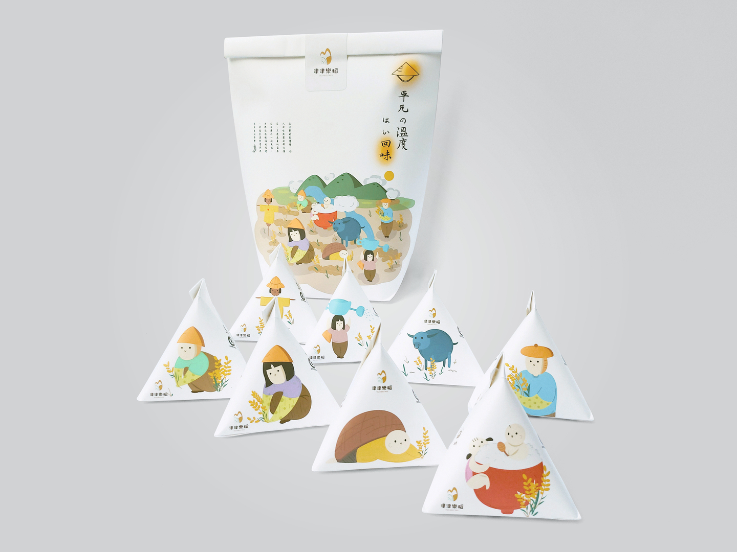 The packaging for this rice brand stands out because of its unusual shape. The packages are small and triangular. That not only makes them convenient to handle, but also gives them an air of exclusivity. Analogous to the brand name Talk About Rice, they are designed with illustrations which are both childlike and minimalist in appearance, showing rural scenes in the rice field. This is intended to appeal especially to the younger generation. In addition, the design aims to communicate the pleasure this staple food brings and, thus, to promote the culture of eating rice.