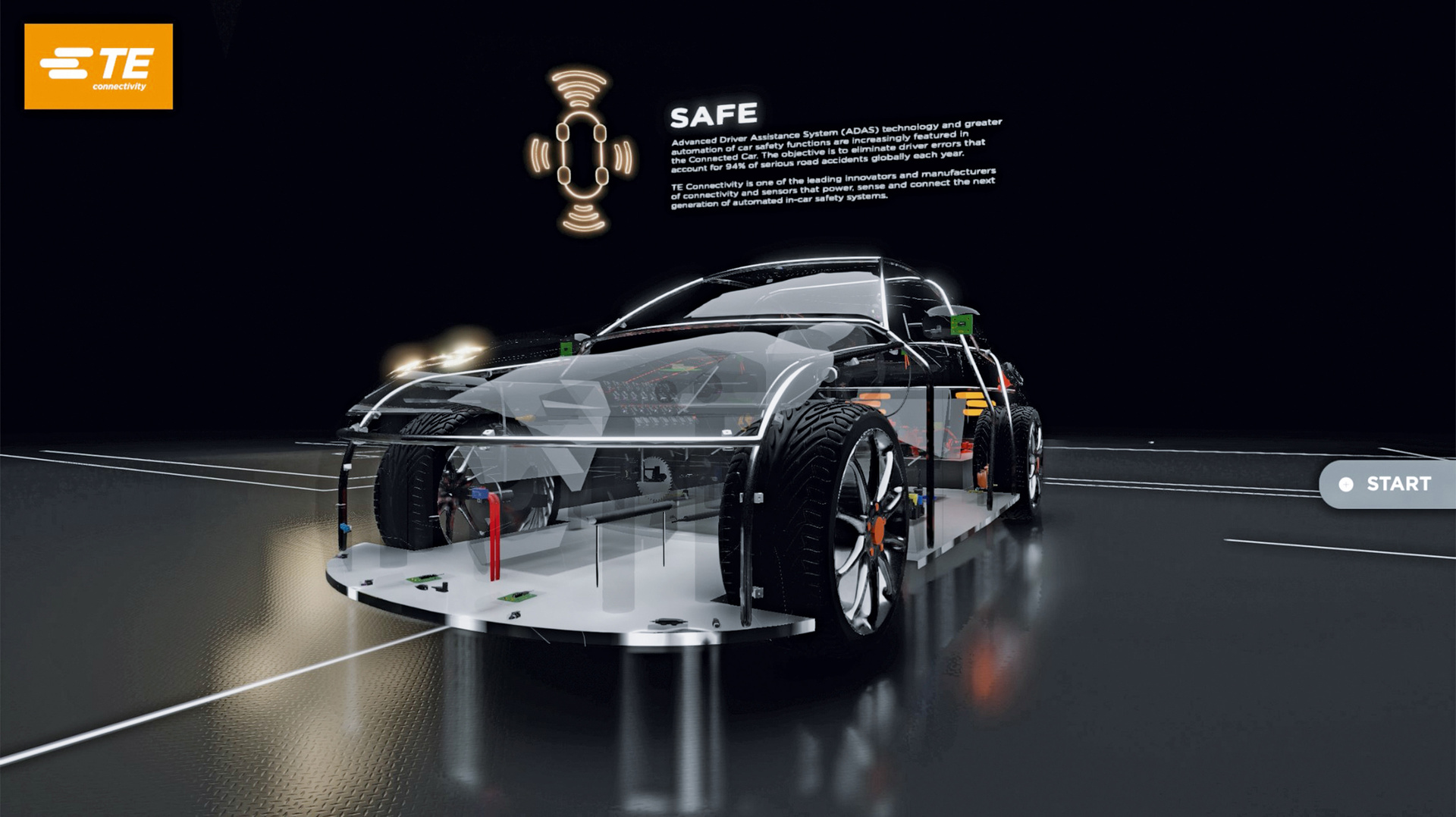 The 3D product explorer developed with TE Connectivity, a leader in connectivity and sensors, showcases 120 automotive products in a freely movable transparent model of a transparent car. Presented on a 98” 4K screen and two smaller flanking screens, this model was transferred into a real-time game engine. In a multistage conversion of industry data, a real-time renderable number of polygons was obtained and then, in combination with lighting and textures, successively increased. The intuitive interface invites viewers to navigate freely through the high-resolution transparent car, to view it from any perspective and to explore the complex products, resulting in a fascinating experience.