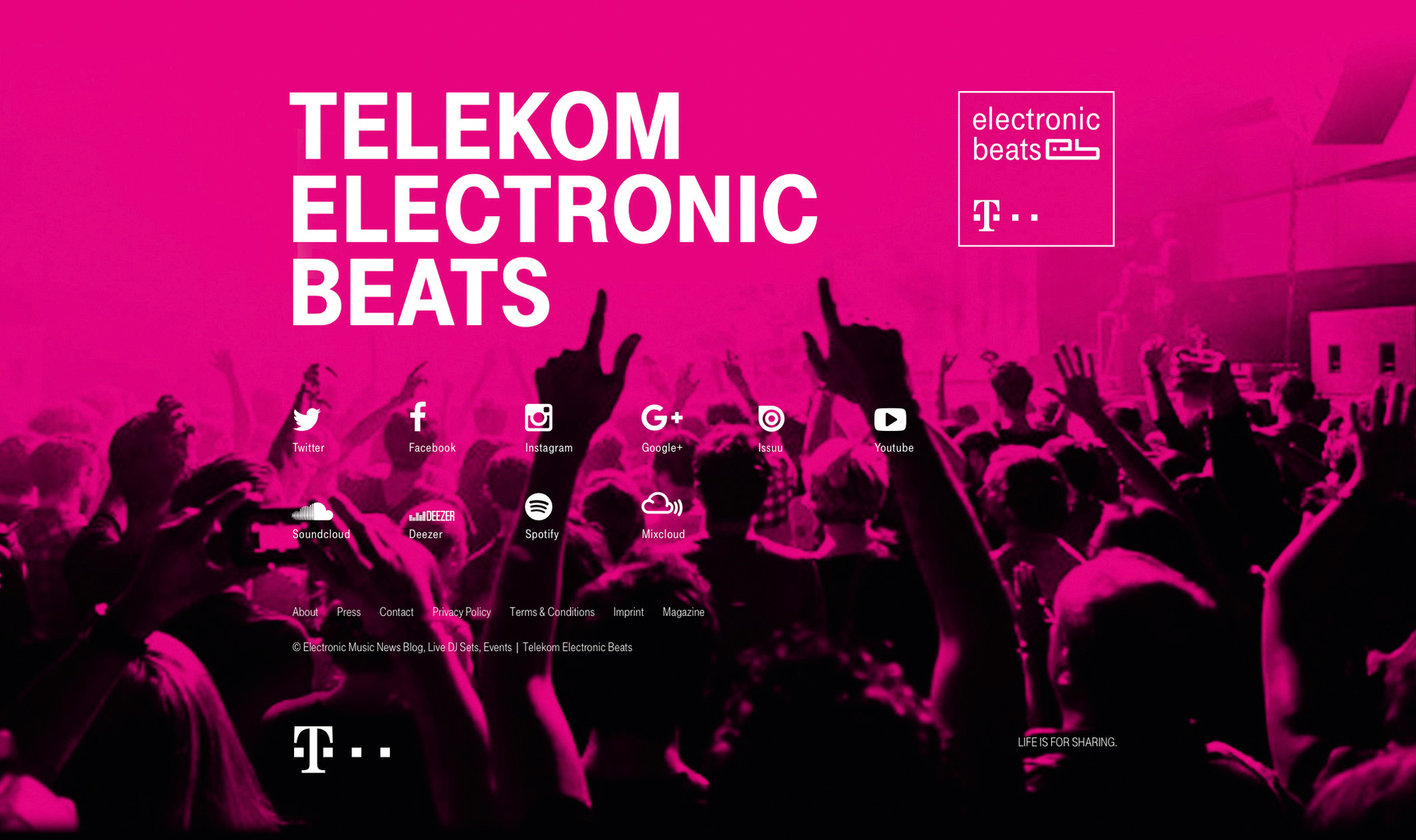 The music-marketing programme Telekom Electronic Beats was established in 2000 to interact with young, well-educated, mobile-first audiences in the context of electronic music and their urban lifestyle. The aim was to create sustainable brand engagement. Under the editorial concept of “Music+”, the social media platforms publish content on a daily basis, featuring musicians talking about influences for their creative work as well as lifestyle aspects from art, technology, design, food and fashion.