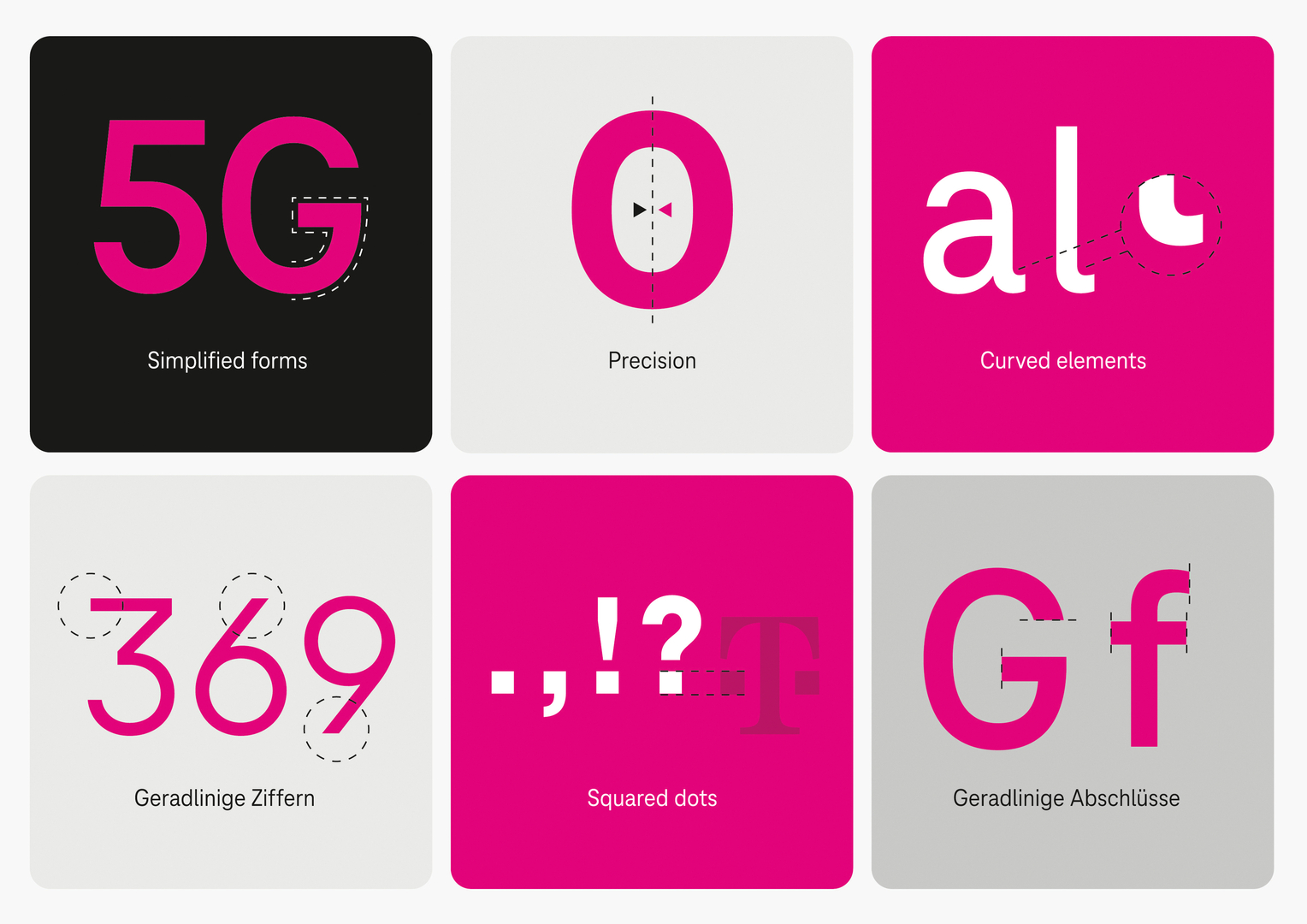 With the specification of a “contemporary appearance and technical upgrade”, the objective of the TeleNeo typeface was to create a visual constant in an increasingly digitalised world. Designed as a new functional typeface with a strong character, distinctive visual elements associated with the Telekom brand were developed. An important task was also to prepare the fonts for future technologies and new digital touchpoints by developing a variable font that brings together the entire font family in small and compact files while offering new technical and typographic features.