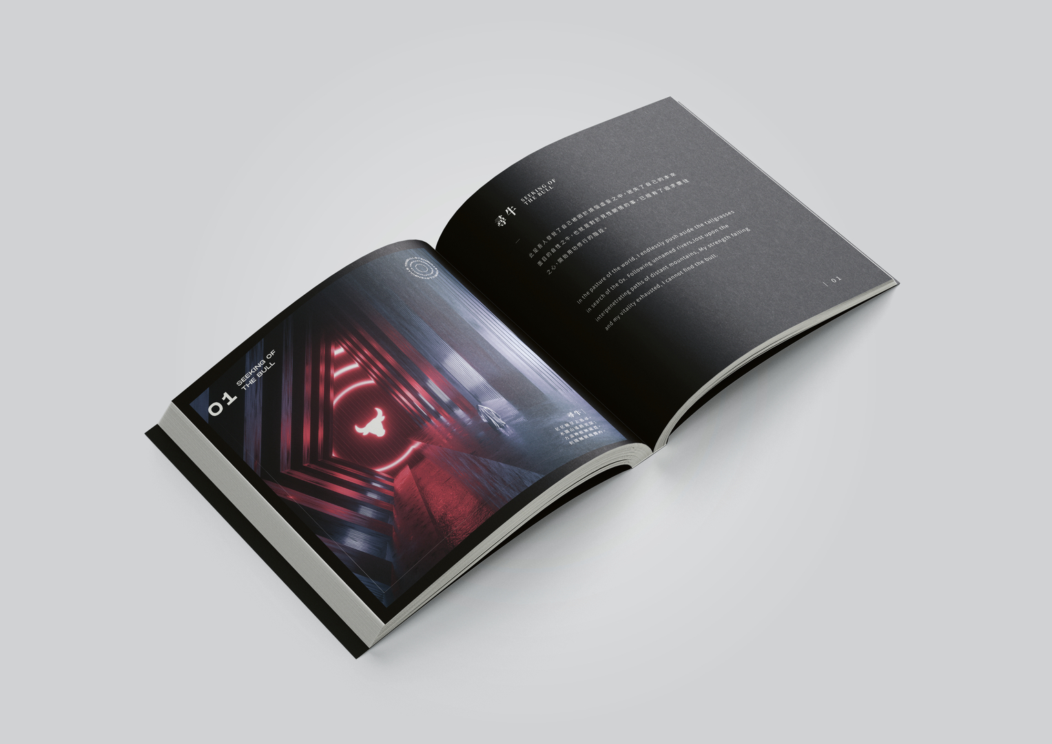 The Ten Bulls is a centuries-old series of drawings accompanied by short poems which portray an oxherd’s search for a bull. It is an allegory for the spiritual journey undertaken by Zen Buddhists on their path to enlightenment. The film translates this motif into a virtual, video-game-like Zen world. The hero strides through the dark, gigantic halls towards the effigy of a bull. Each of the ten bulls from the series is represented in its own specially created set. Red light is used as an atmospheric element within the depicted spaces and also represents the enlightened intellect.