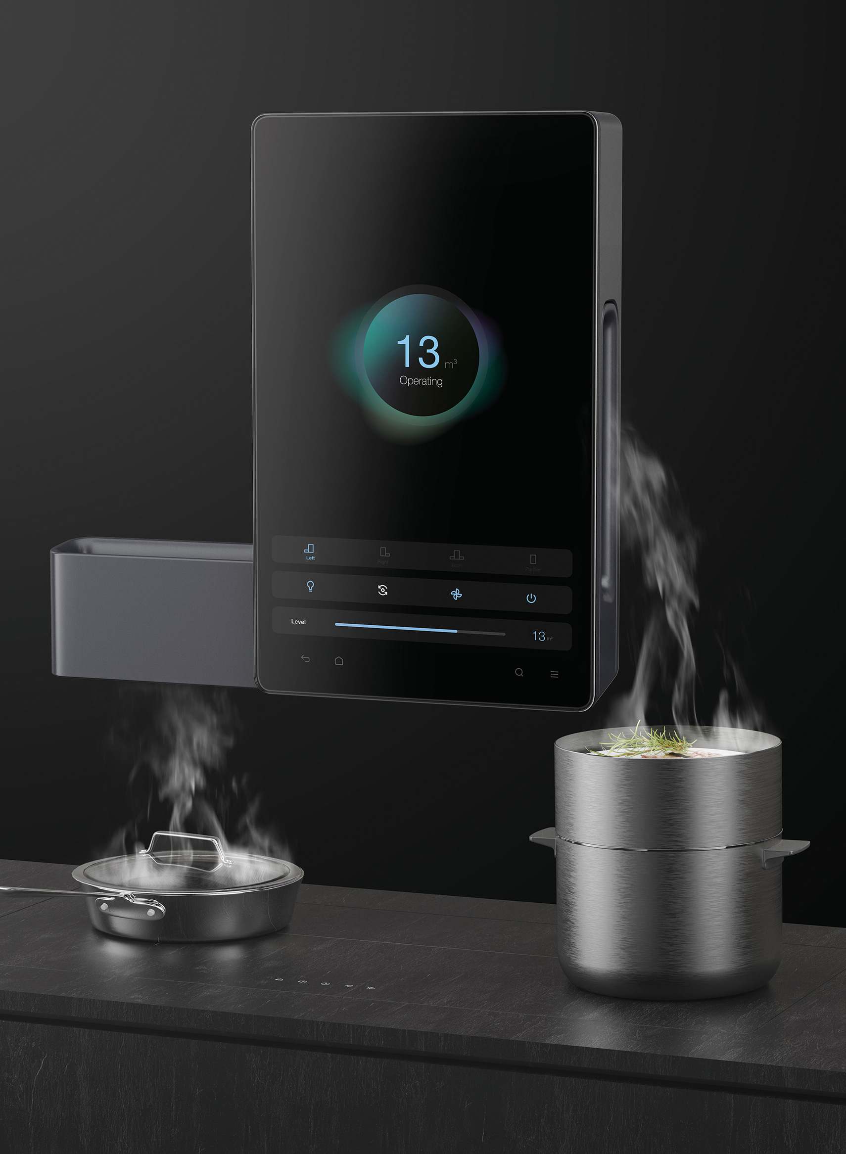 This range hood combines diverse forms with high efficiency and energy conservation. Its 90° rotatable fume inlets adjust to cookware height for close-range suction. When closed, it occupies only 40% of its original width, freeing space for cooking. Hand gesture control adjusts power and wind speed to minimise physical contact. Its compact size simplifies cleaning, making it a practical kitchen addition. Red Dot Award: Design Concept | Concept | Kitchen Appliances and Accessories