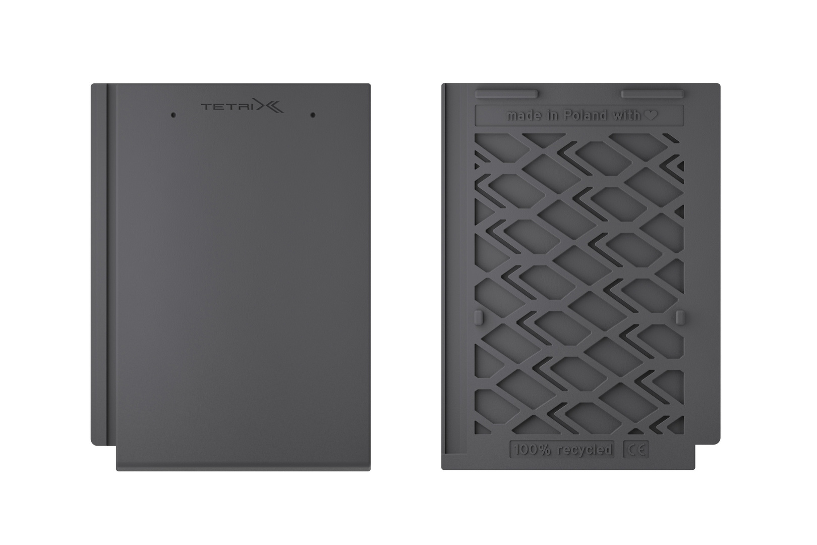 Tetrix Roof Tiles are crafted from recycled plastic composite. The tiles have been designed and engineered to offer a lightweight, durable, and more sustainable alternative to conventional options. The material is frost-proof, waterproof, fungi-resistant, UV-resistant, and has good insulation properties. Built to withstand the test of time, these tiles are virtually unbreakable, ensuring a long-lasting and reliable roofing solution. Tetrix Roof Tiles provide an ideal foundation for photovoltaic systems. They serve as a safe replacement for hazardous asbestos roofs, since they possess similar properties while guaranteeing safety. Thanks to their light weight, these tiles are easier to handle, thereby reducing strain for construction workers during installation. Produced from recycled plastic of packaging waste origin, Tetrix Roof Tiles are mixed with quartz sand to create a durable and long-lasting composite. The manufacturing process utilises modular stamp moulds, which minimises material usage by ensuring compatibility between the bottom parts (same) and top parts (different) across various models. Designed with longevity and material optimisation in mind, Tetrix Roof Tiles follow an innovative grid structure that guarantees rigidity while maintaining their lightweight properties. The entire collection adheres to consistent proportions, with each model having a distinct top surface design. The range of tiles includes a classic flat roof tile, an original wavy modern design, and a roof tile with a captivating triangular pattern, providing options to suit various architectural preferences. Red Dot Award: Design Concept | Ready to Launch | Materials and Surfaces