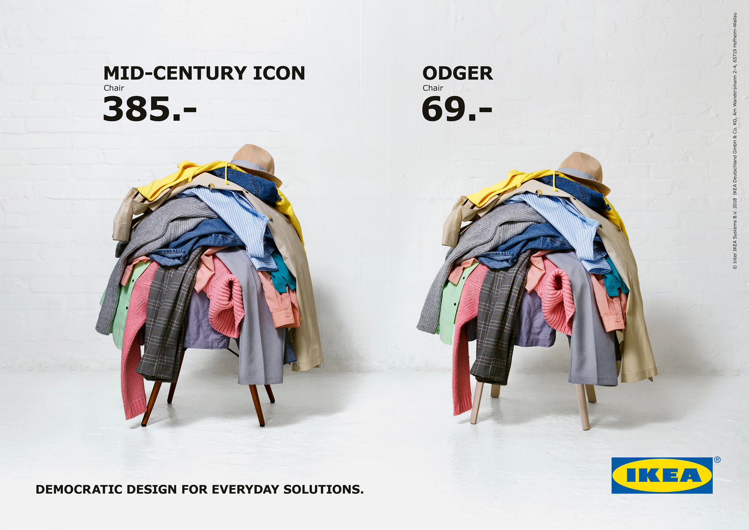 In order to advertise Ikea’s affordable products, this out-of-home campaign focused on a common habit everyone knows. The centre of attention was on chairs because everyone has one particular chair where they just throw their clothes. The funny thing is that when the chair is covered with all that stuff you can no longer see it. So the question is why spend a lot of money on a designer chair when you can’t even see it? Comparing the looks and prices of expensive designer chairs and more moderately priced chairs from Ikea answers this question in a manner that speaks for itself. Both chairs are so overloaded that the only things still visible are their legs, which look astonishingly similar.
