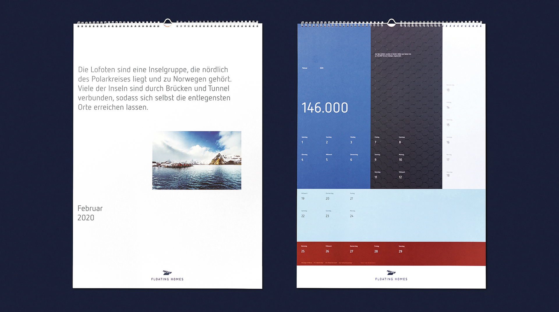 Floating Homes designs and builds floating houses for residential and commercial use. The mechanism of this annual calendar works by extracting specific colour stimuli from a key visual on or near the water and covering them with transparent interleaves to produce a filtered colour carpet. This highlights the fleeting nature of the moments one experiences when living on water and also expands one’s view of life. The orderly graphic and striking layout are supplemented by barely visible, but tactile print finishes that round off the high-quality appearance of this print product.