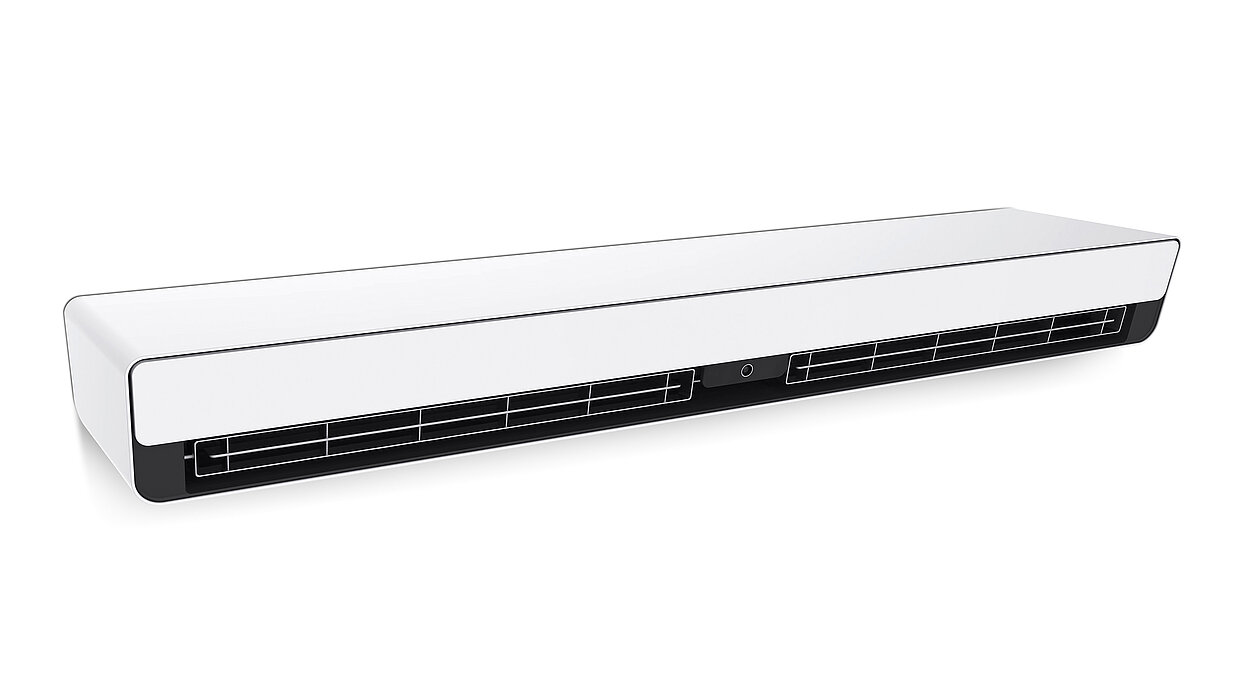 Bei diesem Klimagerät für die Deckenmontage verbirgt sich das Lufteintrittsgitter unter der Abdeckung. Dies verleiht dem Gerät eine puristische Anmutung, da es lediglich aus den beiden Grundformen Kreis und Quadrat zu bestehen scheint. Gleichzeitig verhindert diese Konstruktion, dass Staub in das Innere gelangt. Die Luft tritt an den vier Seiten aus, was sicherstellt, dass sie gleichmäßig im Raum verteilt wird.