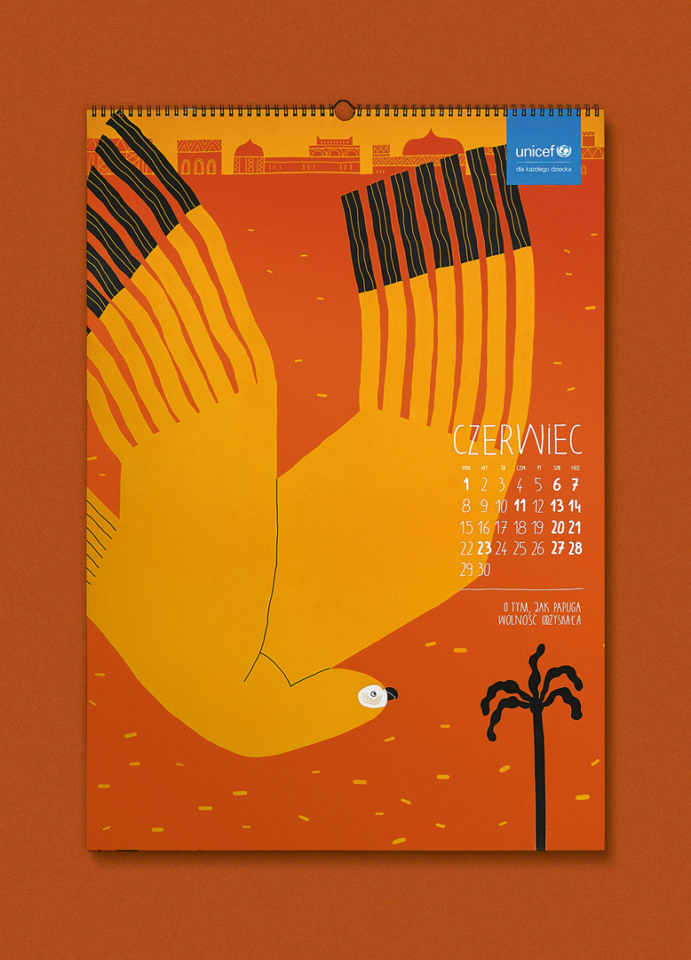 This 2020 charity calendar with handwritten numbers was released to raise funds for the Polish branch of UNICEF, an organisation known for its commitment to helping children worldwide. The main concept was to present legends from countries such as Syria, Sudan, Niger and Yemen in an attractive and distinctive way. A leaflet featuring an entire story is attached to each page, while the back of the calendar can be folded into a box for storing the 12 legends. The front cover can be turned into a mask for use as wall decoration, allowing the calendar fulfil more than one function.