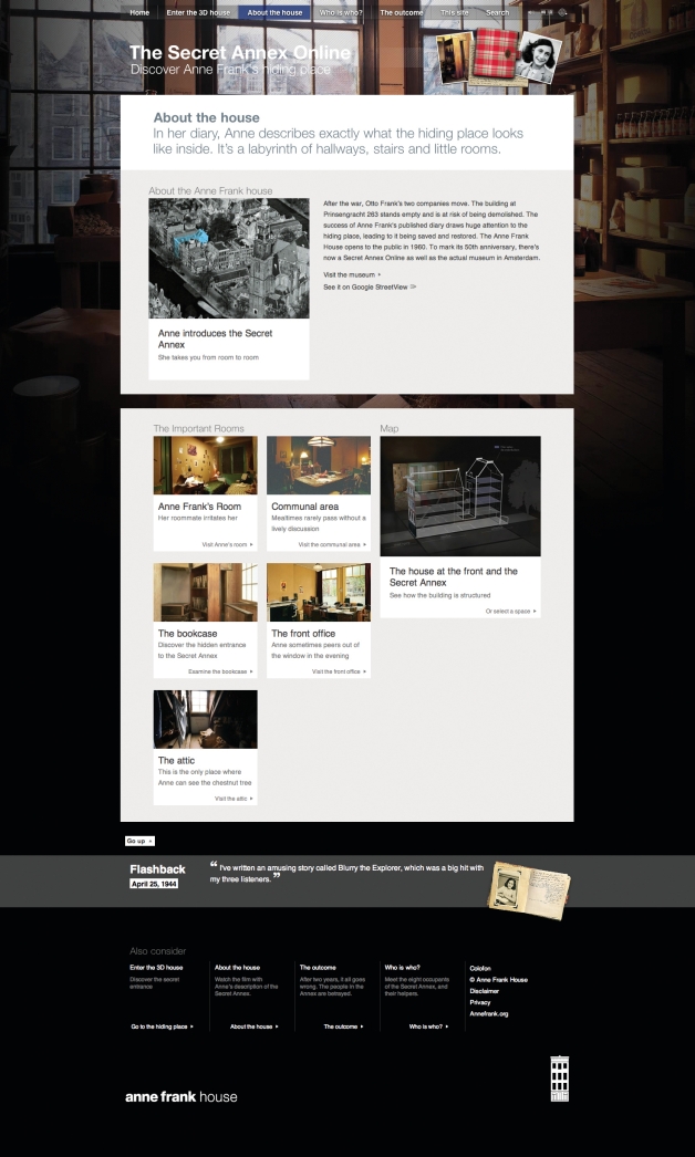 Anne Frank’s wartime diary, written in hiding in Nazi-occupied Amsterdam, is one of the most widely read books in the world. The Anne Frank House museum preserves the hiding place where Anne wrote her diary. The Secret Annex Online was created to enable people worldwide to discover Anne Frank’s story online in a unique way. History comes alive as visitors wander through never-before-seen furnished rooms. It is meant for those who cannot visit the museum, and for those who want to enhance their museum visit. Approximately 900,000 users have already visited the site, staying on average for 17 minutes.