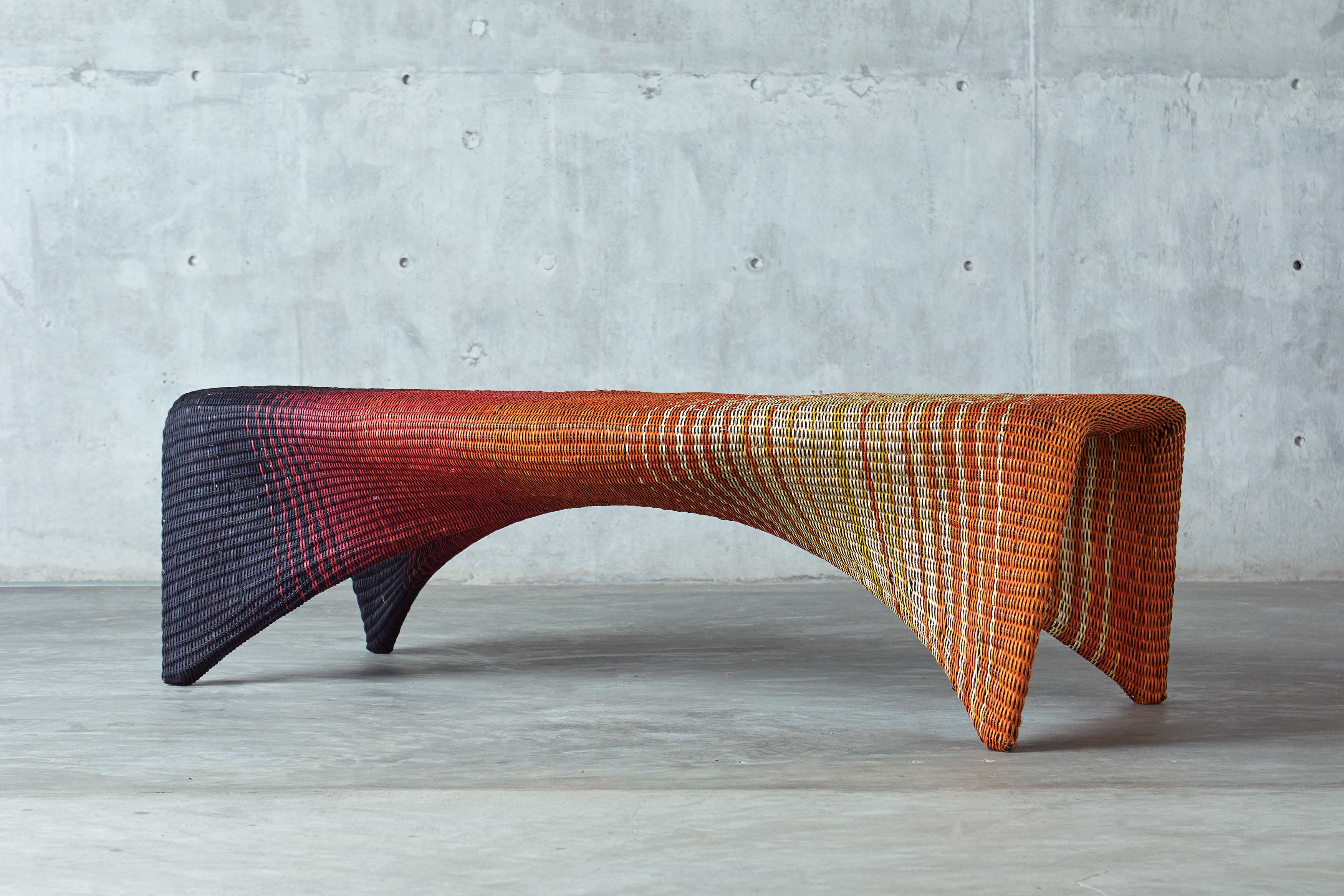 The SUNSET BENCH by The Wicker Story represents an effort to merge traditional Indian craftsmanship with contemporary design. The bench captures the hues of the setting sun in its structure and intricate gradient weaving patterns. Using a lightweight frame crafted from sustainable cane and rattan, SUNSET BENCH fits seamlessly into any setting while emphasising eco-friendliness and cultural authenticity in its construction.