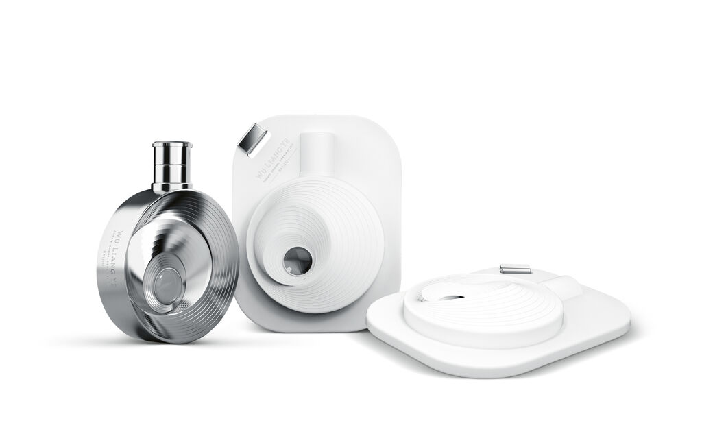 The Wuliangye Project Vision verbindet die Ästhetik industrieller Mechanik mit der Fibonacci-Spirale und symbolisiert so die Verbindung von Natur, Zeit und Innovation. Die Umverpackung der erlesenen und traditionellen Spirituose lässt bereits die exakten Kurven und strukturelle Form der Flasche erahnen. Ein gläsernes Sichtfenster gewährt zudem einen Blick ins Innere. Die Proportionen der hochwertigen Metallflasche entsprechen dem Goldenen Schnitt, und ihr spiralförmiger Körper lädt den Nutzer zu spielerischer Interaktion ein.