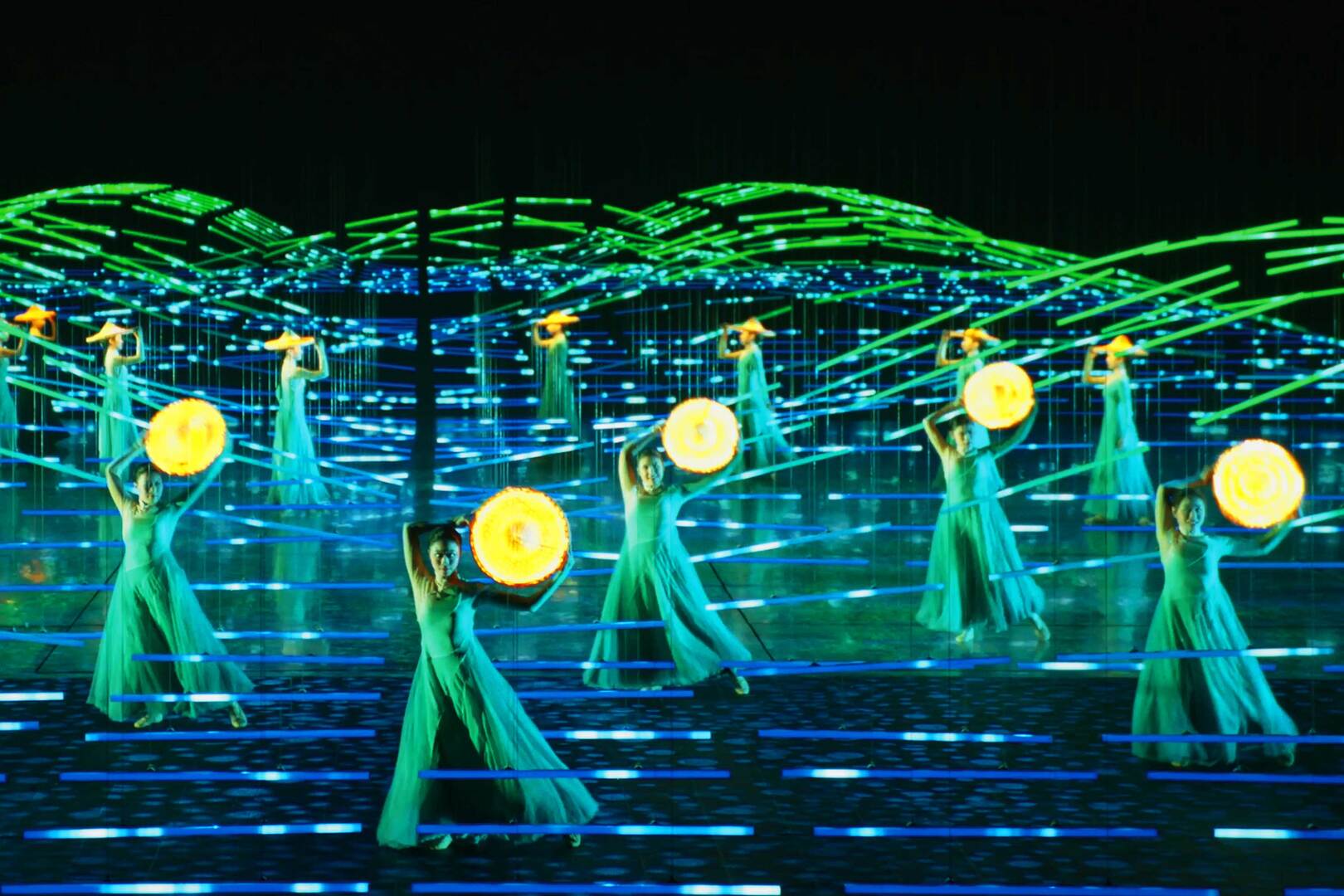 Within a stage area of 2450 square metres, 468 LED strip lights are installed to form a matrix of lights with a total of 936 lifting points conducting up-down movements controllable by CNC. Through the CNC technology, 468 LED strip lights create various scenes by moving, combining, shifting and going up and down uninterruptedly in the stage space, presenting flowing pictures of light strips in the physical space.