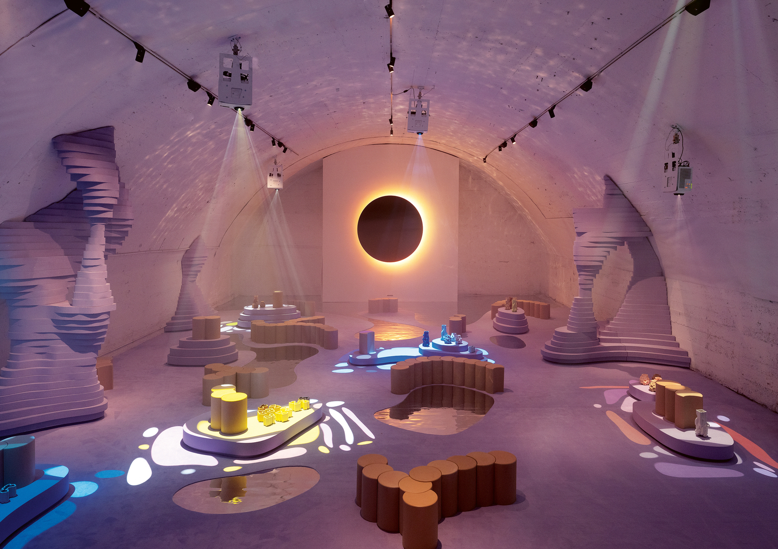 The TIDES exhibition at Ventura Centrale during Milan Design Week 2019 took inspiration from the complex “dance of gravity” that leads to the phenomenon of tides. It offered a temporary experience where time, colour and light became fluid like the ocean. The exhibition showcased 100 stools by the designer Kwangho Lee from the series “The Moment of Eclipse”. Each eclipse-shaped stool was connected to the next one, forming chains of endless variations. Through an abstract “low tide landscape”, the exhibition created an “otherworldly landscape” that invited visitors to take a low tide walk in changing light and colours.