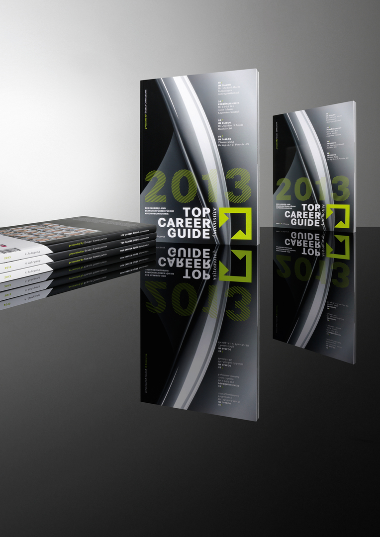 The “Top Career Guide Automotive” is a business magazine for top decision-makers. Published for the first time in 2004, the magazine was revised and realigned in 2012, both in terms of its editorial content and conceptual design. With a clear design language and a variance for the categories in the layout, the intention is translated into the design. Finely tuned and typographically outstanding, combined with a high-quality language of pictures, this also visualises the premium demand. Individual brand stories with interesting tales about personalities from the automotive industry are specifically designed and abandon the defined “frames” of layout, chromaticity, typography and paper. The “Top Career Guide Automotive” is a business magazine with a “collective character”.