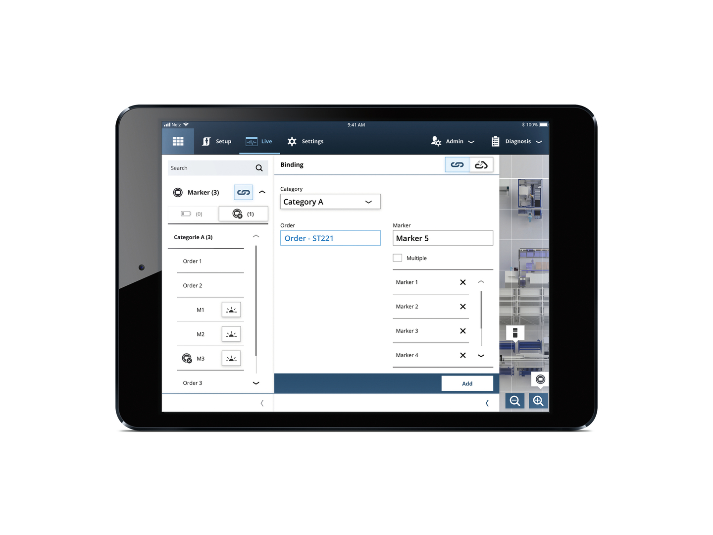 Track&Trace is a system for networked manufacturing that uses satellites positioned in the production area to communicate with markers placed on work pieces. Via the user interface, orders and markers can be linked to locate sheet metal parts, tools and orders on the map in real time. The UI design was developed for mobile TRUMPF applications and picks up on the colour palette and orthogonal form language of the product design. Thanks to movable side menus, the map as the central element of the user interface is given more space for a better overview.