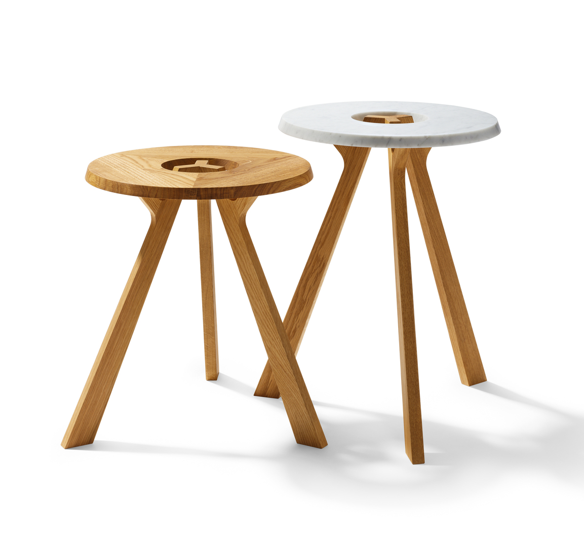 Der Beistelltisch treeO ist in zwei Höhen und optional mit Holz- oder Marmortischplatte erhältlich. Die kreisrunde Öffnung in der Mitte gibt den Blick auf die elegante Holzverbindung frei und dient als praktische Griffmöglichkeit, um den Beistelltisch bequem zu tragen. Dabei ist die Oberkante des zentralen Knotenpunktes auf gleichem Niveau wie die ringförmig umlaufende Ablagefläche und wird damit zu einer praktischen Erweiterung derselben.