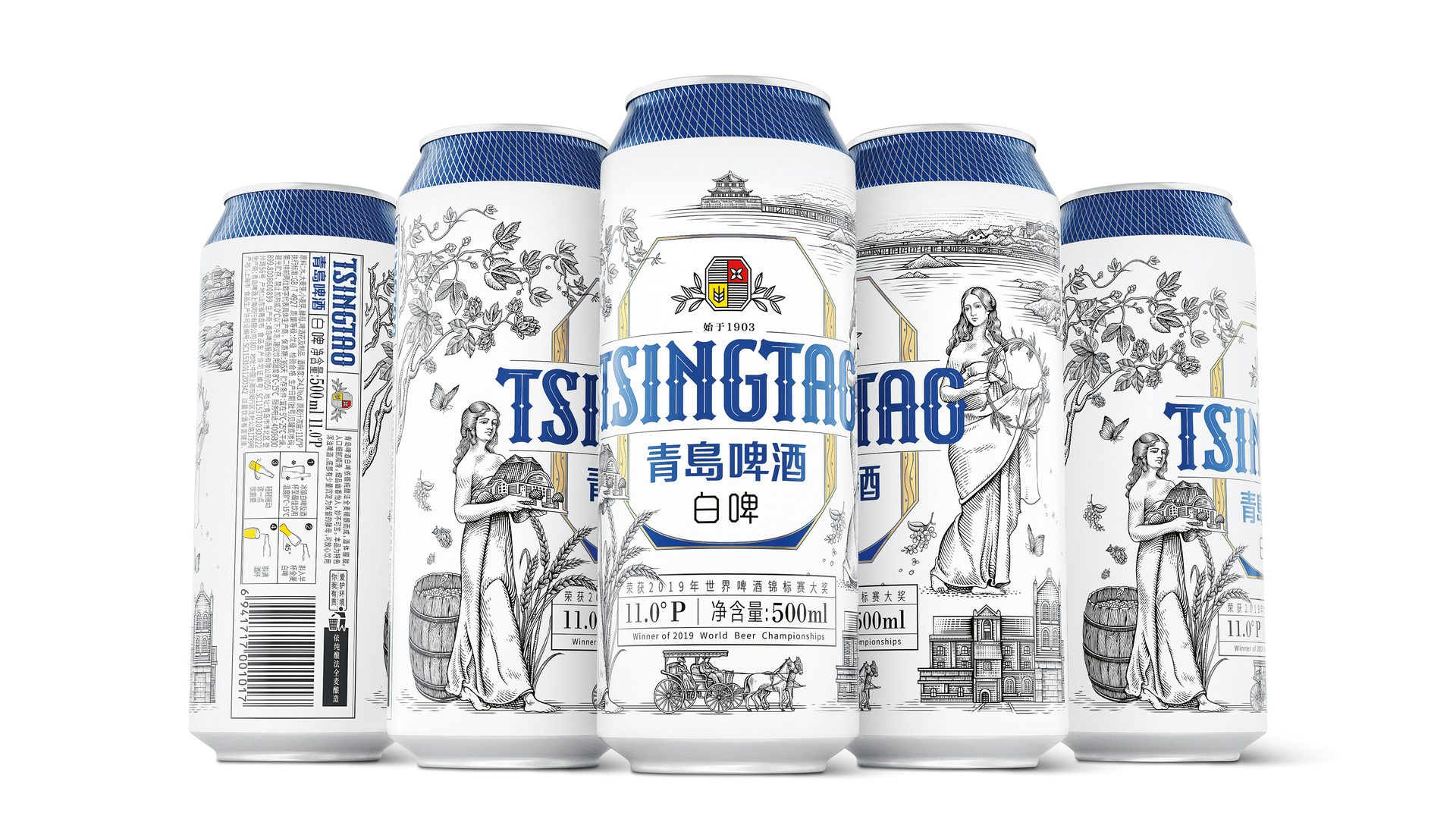 Tsingtao White Beer is sold in bottles and in cans. Their design centres around the manufacturer’s traditional coat of arms, with a new typeface to upgrade the appearance. An image of an ancient goddess adorns each side of the coat of arms, alongside references to brewing, such as hops, wheat or a master brewer. The imagery creates associations with freshness, aroma and the authentic taste of beer. The design combines the main colours of white and blue with a little red and gold. The bottle has a label around its neck, while the can features a blue pattern at its top end.