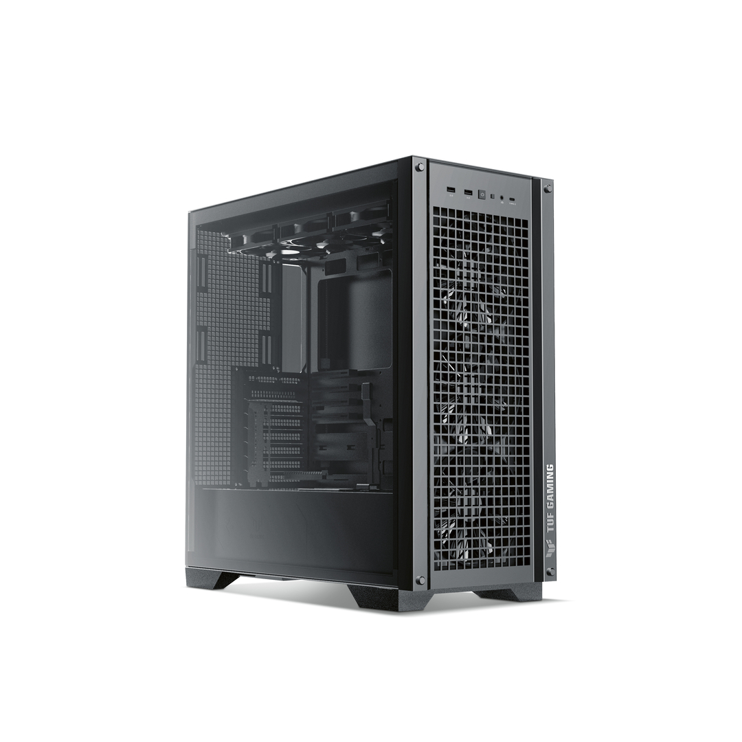 TUF Gaming GT302 ist ein Gehäuse für Gamer mit einer optimierten quadratischen Mesh-Frontplatte und auswechselbaren Seitenwänden. Hier kann zwischen Glas und Gittergewebe gewählt werden. Vier integrierte Hochleistungslüfter ermöglichen eine gute Kühlung. Trotz der kompakten Form bietet das Gerät genügend Platz für leistungsstarke Hardware. Es verfügt über ein abnehmbares Oberteil für eine schnelle Installation von AIO-Kühlern. Ein Motherboard mit versteckten Anschlüssen wird vom internen Aufbau des Gehäuses für ein sauberes Kabelmanagement unterstützt.