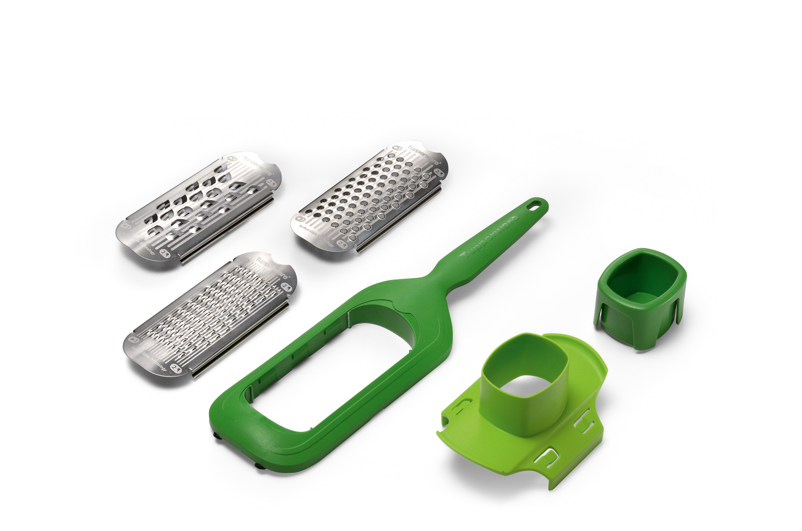 Die Gestaltung der Tupper-Profi-Reibe ist auf eine optimierte Funktionalität ausgerichtet und wird ergonomischen Anforderungen gerecht.