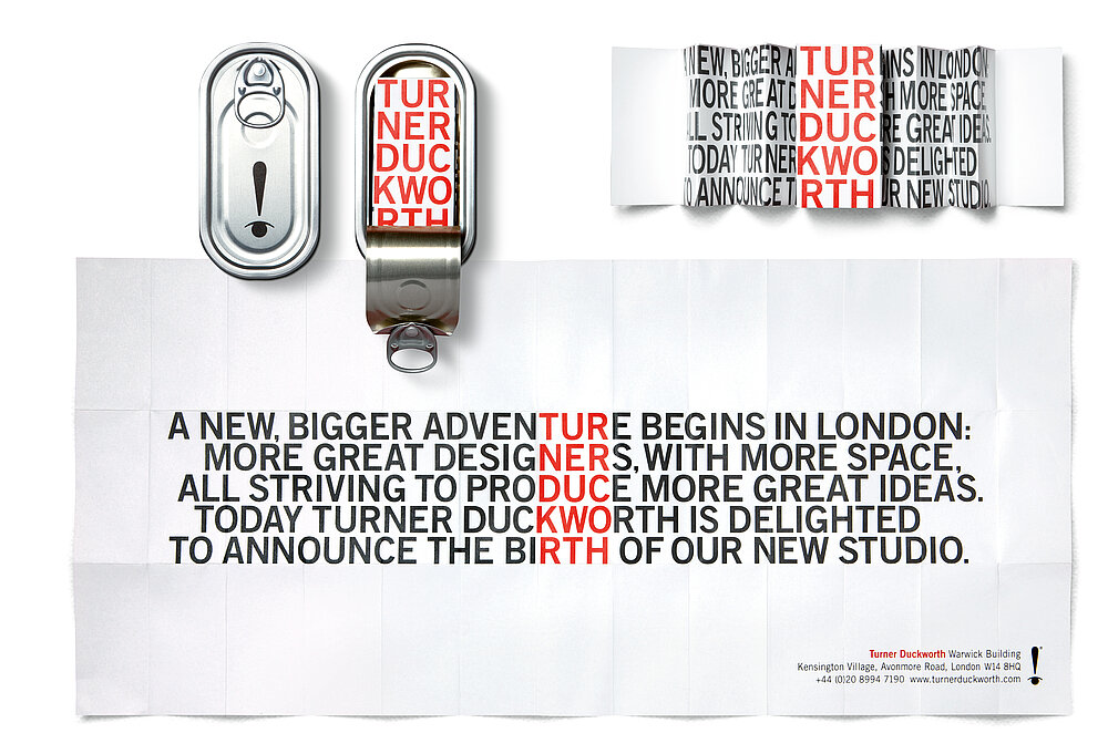 In order to celebrate the move from where it was founded to a larger London studio, this mailing was briefed to be memorable and, most importantly, to represent the growth of Turner Duckworth. The humorous observation of being packed in like sardines in a previously much smaller studio formed the basis for the creative idea. The wit and surprise of being confronted by a sardine tin creates a memorable moment whilst also giving a nod to its origins as a packaging design agency. When the tin is ripped open, it reveals a confined typographic Turner Duckworth, representative of the previous lack of space. When fully extended, a descriptive passage captures the benefits of the larger studio, with the name seamlessly incorporated in the copy.
