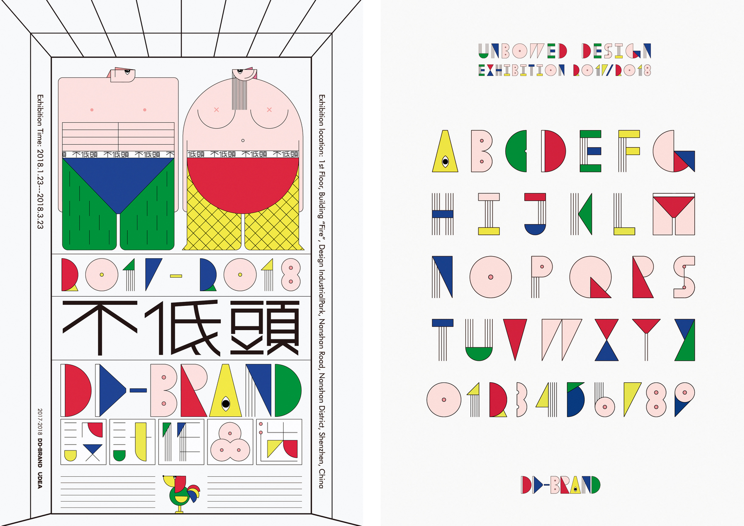 The Unbowed Design Exhibition is the annual review of a Chinese design firm. The fact that the design works are hanging from the ceiling gives the word “unbowed” a special significance and also conveys the designers’ attitude to their designs. The brand promotion for the exhibition is characterised by brightly coloured, geometrical shapes with the aim of giving the beholder a pleasant visual experience. Among other things, a mascot was designed which combines the two animal signs of the Chinese zodiac from 2017 and 2018. The mascot has a dog’s head and a rooster’s body. Additionally, an exclusive exhibition bank note was designed which serves as an entrance ticket.