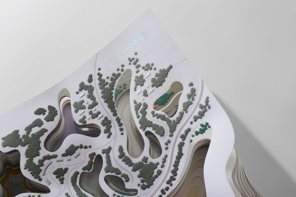 Das UPM Raflatac Swatchbook präsentiert unterschiedliche Etikettenmaterialien in taktiler Formgebung als Schweizer Broschur. Deren Seiten schichten sich zu einer Landschaft, die an den Unternehmenssitz Finnland mit seinen zahlreichen Seen erinnert. In gestanzter Form sind die Gewässer in illustrierte Landschaften aus der Vogelperspektive eingebettet. Prägungen setzen dabei einen haptischen Reiz. Auf diese Weise zeigt sich überdies die unterschiedliche Wirkung von Druckfarben und Veredelungen auf den jeweiligen Materialien.