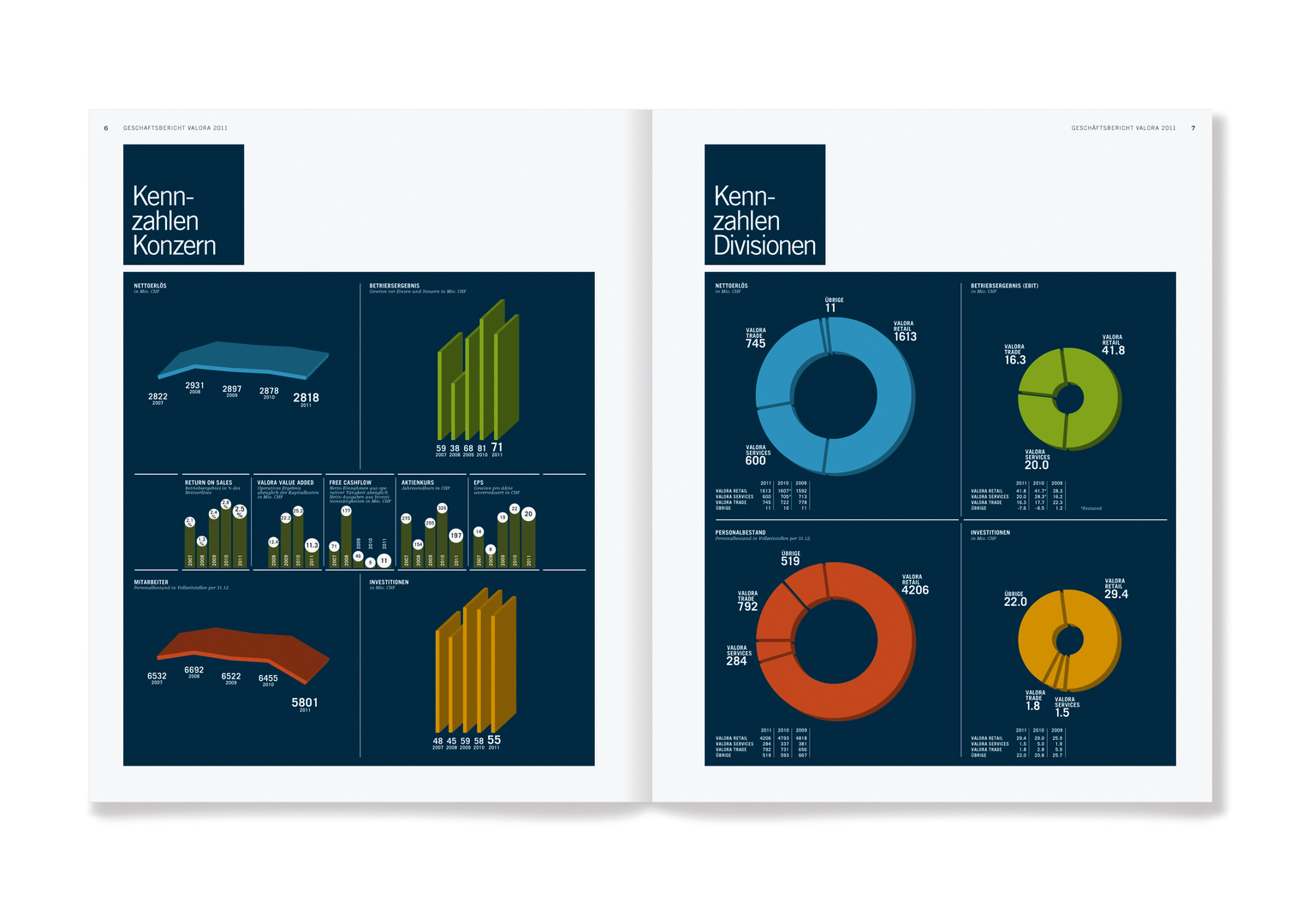 The Valora annual report not only outlines the current activity of the trading enterprise, it also presents its entrepreneurial vision, explaining objectives and corresponding strategies. Miniature information graphics on the cover page and inside the report make a valuable contribution to this. In the enclosed magazine the company tackles an emotional topic, the “women’s question”. Successful women introduce themselves and contribute to the debate on the unused potential of women in the world of labour.