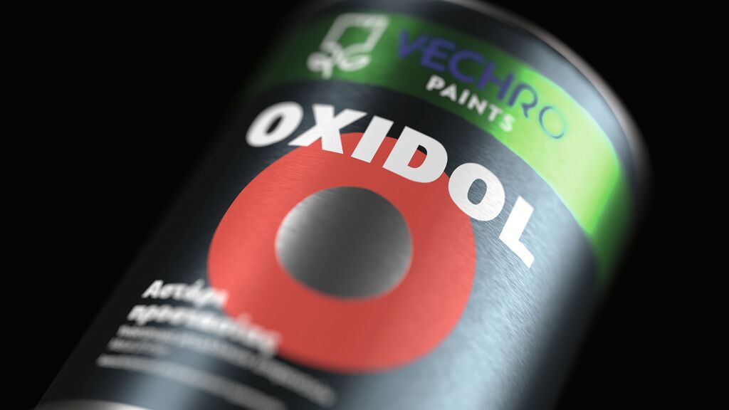 As part of a corporate identity rebranding for the Greek company Vechro, the appearance of the Oxidol family of primers and lacquers for metal surfaces was also redesigned. The packaging had to incorporate the new Vechro logo and fit organically into the brand architecture. The result is a design with concentric rings suggesting the way the paint protects the layers of a metal surface, as the erosion of metals occurs gradually from outer to inner layers. The colour coding of the variants followed that of the earlier packaging, creating a playful effect between the varnished and unvarnished surfaces of the tinplate cans.
