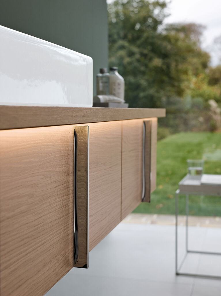 Bei der Badmöbelserie Vero verbindet sich eine klare Formensprache mit dem Material Holz zu einem harmonischen Ganzen. Alle Elemente sind überzeugend im Detail und perfekt aufeinander abgestimmt. Ein Erlebnis guten Designs sind die flach gestalteten Türen sowie die Form der Konsole. Mit ihrer ausgereiften Funktionalität bietet diese Badmöbelserie dem Nutzer viel individuellen Komfort.