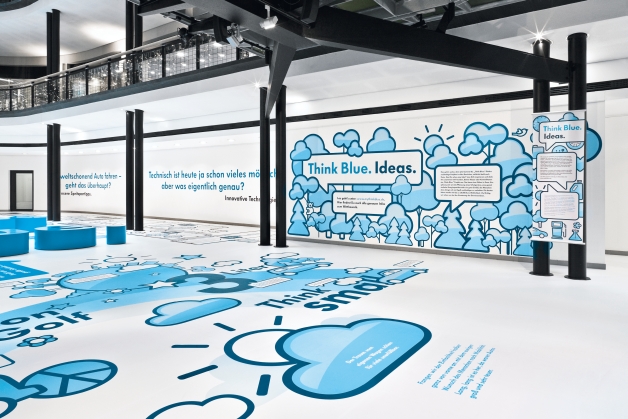 With the message “Think Blue.” Volkswagen wants to get people interested in the topics of ecology and sustainability. An exhibition on that topic at the Volkswagen Automobil Forum Unter den Linden in Berlin in 2010 presented a “Think Blue.” landscape, spread on 600 sqm, which communicated content and information about sustainability in an original way. The exhibition space turned into an experience: questions inspired to participate and think; answers on the ground navigated through the course. The three-dimensional lettering “Think Blue.” served as seating furniture.