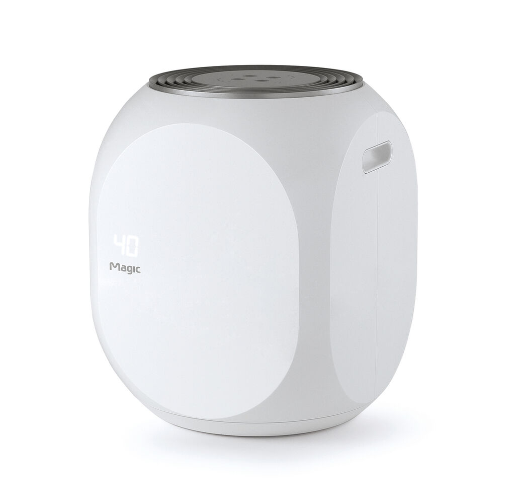 Mit seiner skulpturalen Formensprache wertet der Luftbefeuchter jeden Raum auf. Diese simple runde Gestalt verkörpert Feuchtigkeit und Luft. Das Gerät lässt sich leicht zerlegen, um es zu reinigen. Da sich die Bedienelemente an der Oberseite befinden, ist auch die Bedienung denkbar einfach. Das Produkt arbeitet leise, besitzt einen fest integrierten Textilfilter und eignet sich bestens für den temporären Einsatz.