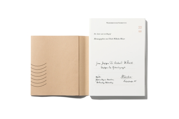In the 22nd edition of the Warmbronner Schriften (Warmbronn Scriptures), titled “Der Autor und sein Biograf” (The author and his biographer), the correspondence between the poet Christian Wagner and his friend and benefactor Richard Weltrich from 1886 to 1912 is examined. Already the cover illustrates in its feel the fleetingness of an envelope. The graphic citation of a postmark leads with its finely curved lines into the lively dialogue. The sections of each letter writer are being highlighted with fine straight and wavy lines, and a considerate typography provides orientation between the author’s comments and the letter quotes.