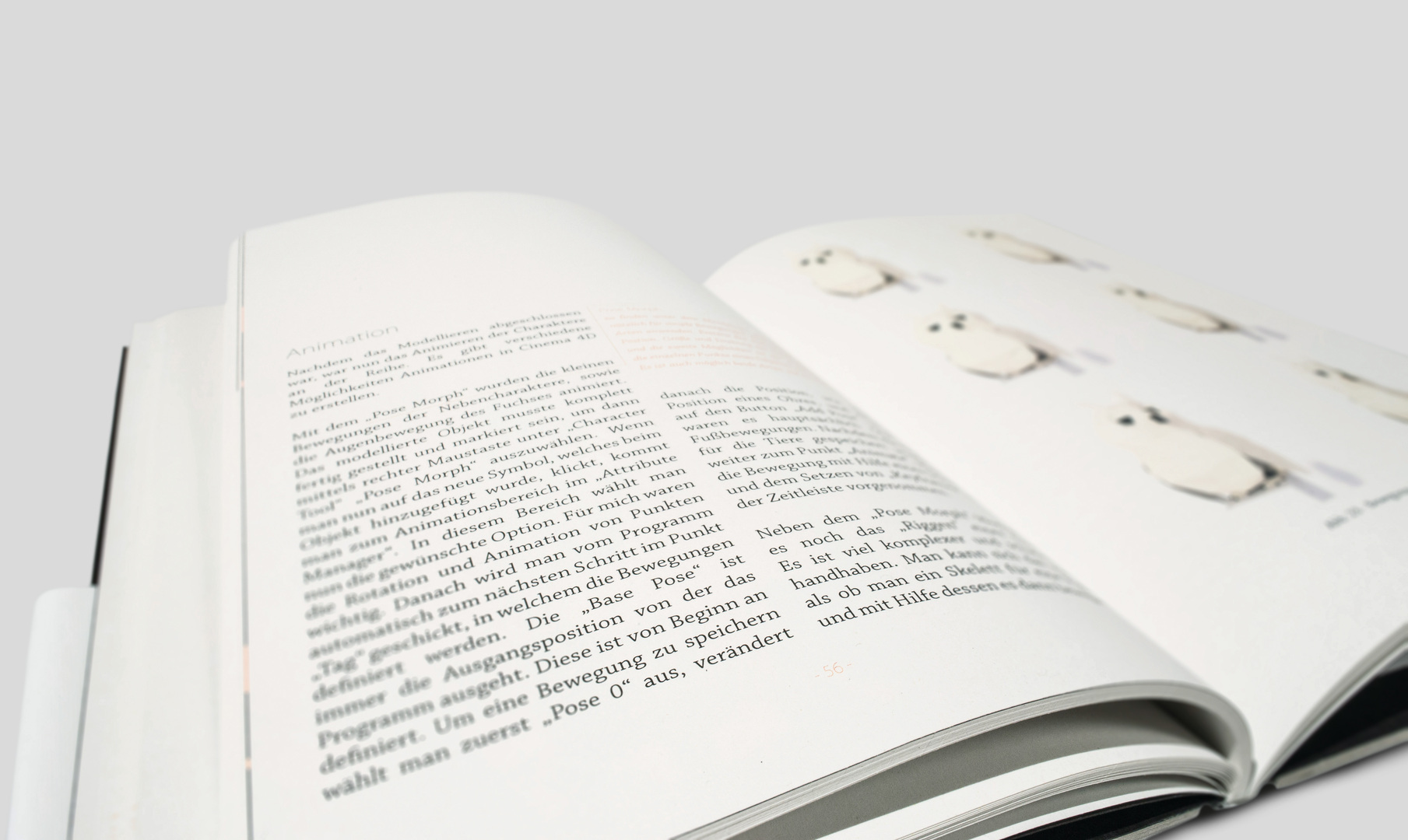 This work is based on Where is Lou?, a 3D animated short film in low poly style. This publication takes a close look at the question of how an environment with characters for an animated short film can be created in consideration of the low poly style. At the same time, the artificial world of the animation is supposed to deliver some sense of realism. The book features numerous coloured, full-page still pictures taken from the film. The cover is made of cardboard and shows an illustration while the book title is given on a paper sleeve.
