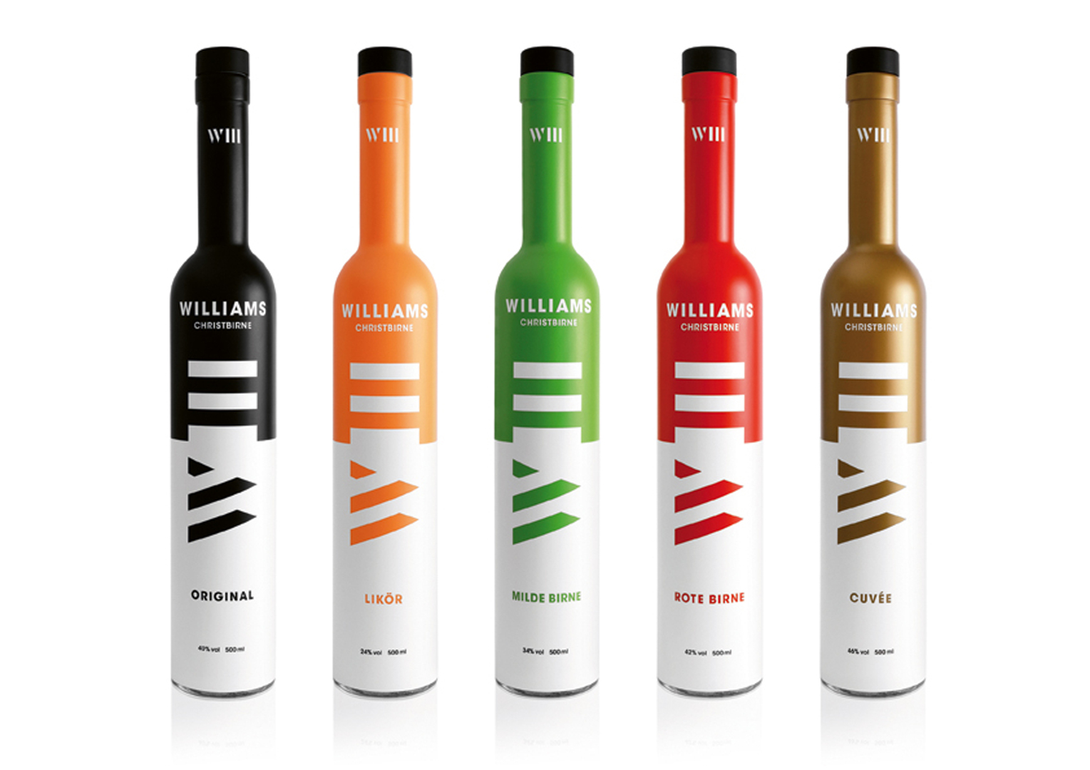 This modern and memorable corporate design aims to arouse the interest of a young target group in the traditional Williams Christbirne liquor. The product bottles have been fully refined, showcasing a bold and fresh design. The colours create a precise identity which reflects the flavourful content. Featuring a minimalist appeal, the packaging focuses only on relevant data. On the back, the bottles advertise in a personalised tone and with humorous descriptions. Matching overpacks emphasise the special value of the drinks and increase attention.