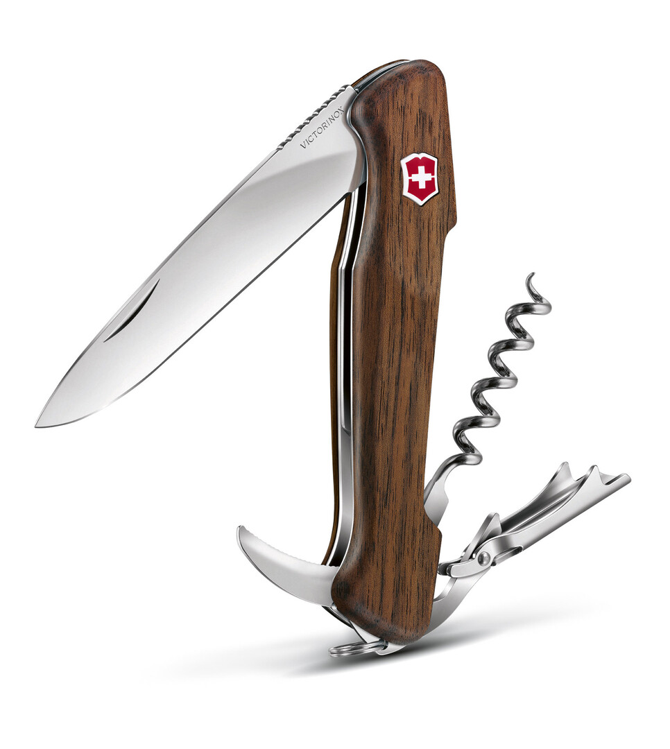 Zum Öffnen von Weinflaschen bietet der Wine Master passende Werkzeuge: Auffallend ist der lange Korkenzieher mit fünf Windungen. Er wird unterstützt durch ein spezielles Kombinationswerkzeug, welches das Entkorken durch eine zweistufige Stütze vereinfacht sowie als Kapselheber dient. Neben der großen Feststellklinge dient eine kurze Wellenschliffklinge zum Entfernen von Weinflaschenkapseln. Das Taschenmesser im Lederetui ist optional in dunklem Nussbaum oder hellem Olivenholz erhältlich.