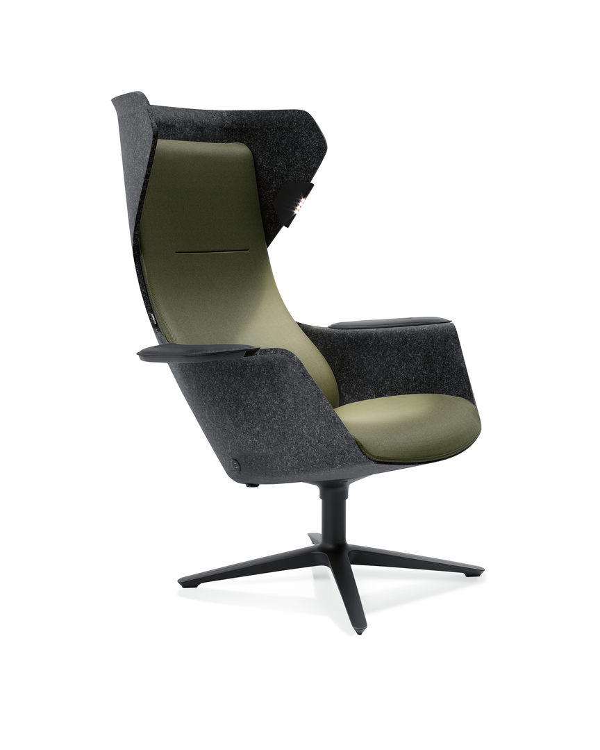 Der Name des wohnlich gestalteten Schalensessels Wooom Light setzt sich aus den Worten „Work“ und „Room“ zusammen. Damit er auch im Büroalltag genutzt werden kann, ist er mit einer USB-Ladebuchse und einem Arbeitslicht ausgestattet, das sich in Helligkeit und Lichttemperatur dimmen und über eine intuitive Touch-Funktion steuern lässt. Das Material, aus dem der Sessel gefertigt ist, enthält bis zu 60 Prozent wiedergewonnene Polyesterfasern und ist vollständig recycelbar. Zudem ist es leicht, robust, schallabsorbierend und einfach zu reinigen.