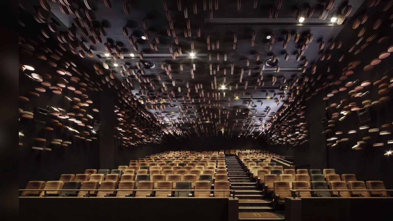 The interior design of this cinema impresses with an exceptionally powerful staging comprising huge round wood plates that symbolise old film reels as a classic symbol of cinema art. Mounted unevenly onto the ceiling and sublime in appearance, they define the room ambiance. Together with the refined brown stone floor and seating corners in elegant green, they project a unique experience.
