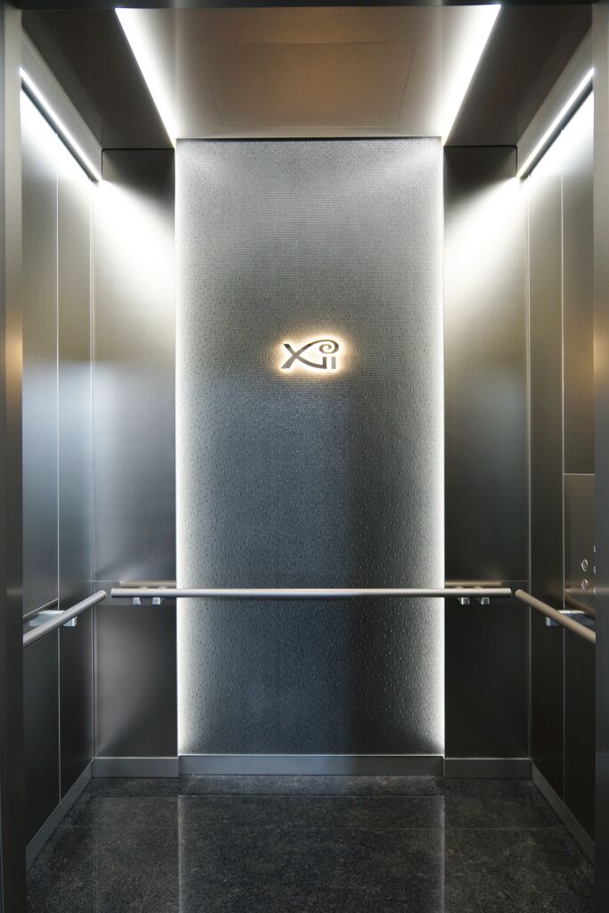 Die Gestaltung des Aufzugs Xi-Elcar mündet in ein Interieur, in dem sowohl der Funktionalität eines stark frequentierten Transportmittels als auch dem Bedürfnis nach Sicherheit Rechnung getragen wird.