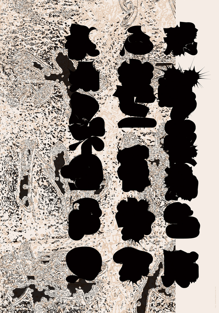 The Heart Sutra, Xin Jing in Chinese, of Prajna Paramita leads to the core of Buddhist teachings: the understanding that emptiness means independence and freedom, enabling a clear and wise view of the world. This aspect is presented by the posters in a clear-cut design. Due to their splodge-like depiction in black ink, the individual characters are hard to be recognised as such. They extend their boundaries, overlap each other, blur and stand out clearly from the light background, which features an abstract pattern.